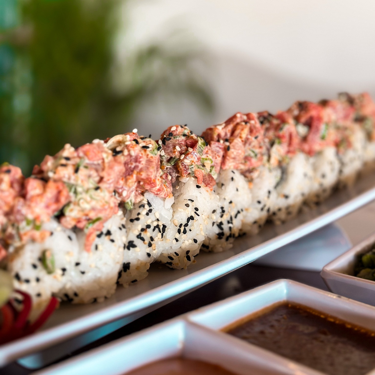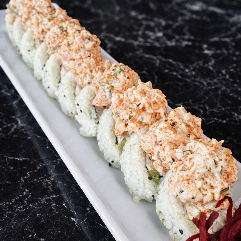 Rollo natural relleno de camarón, pepino, aguacate y queso philadelphia con topping de spicy de atun.