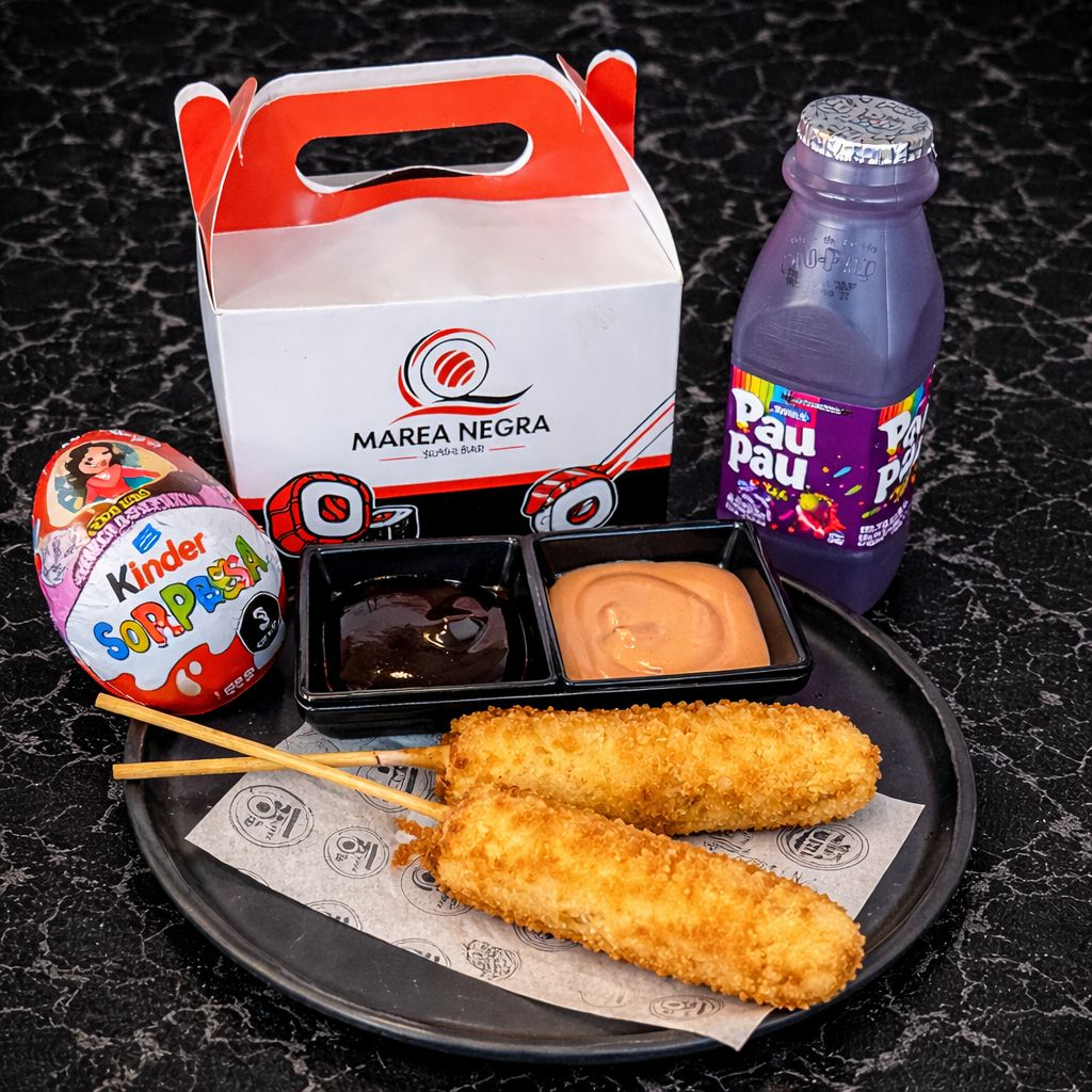 brochetas empanizadas acompañadas de tonkatsu y mil islas,incluye juguito y huevito kinder