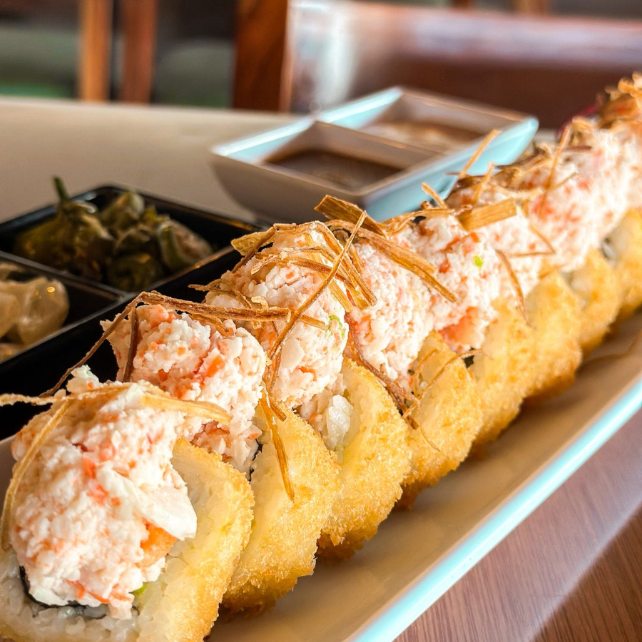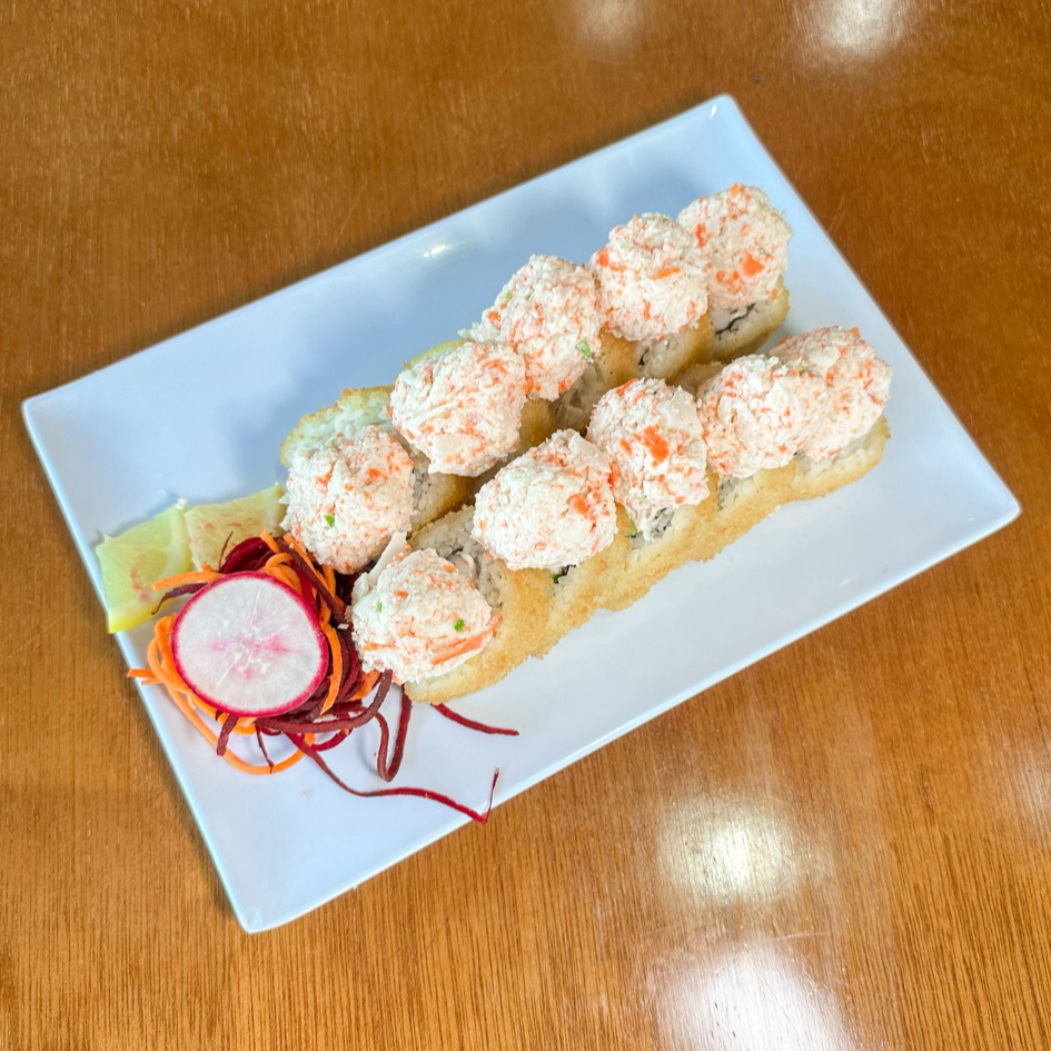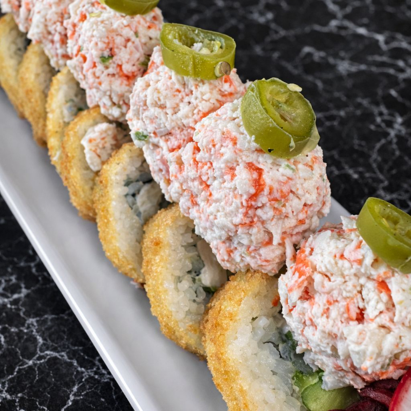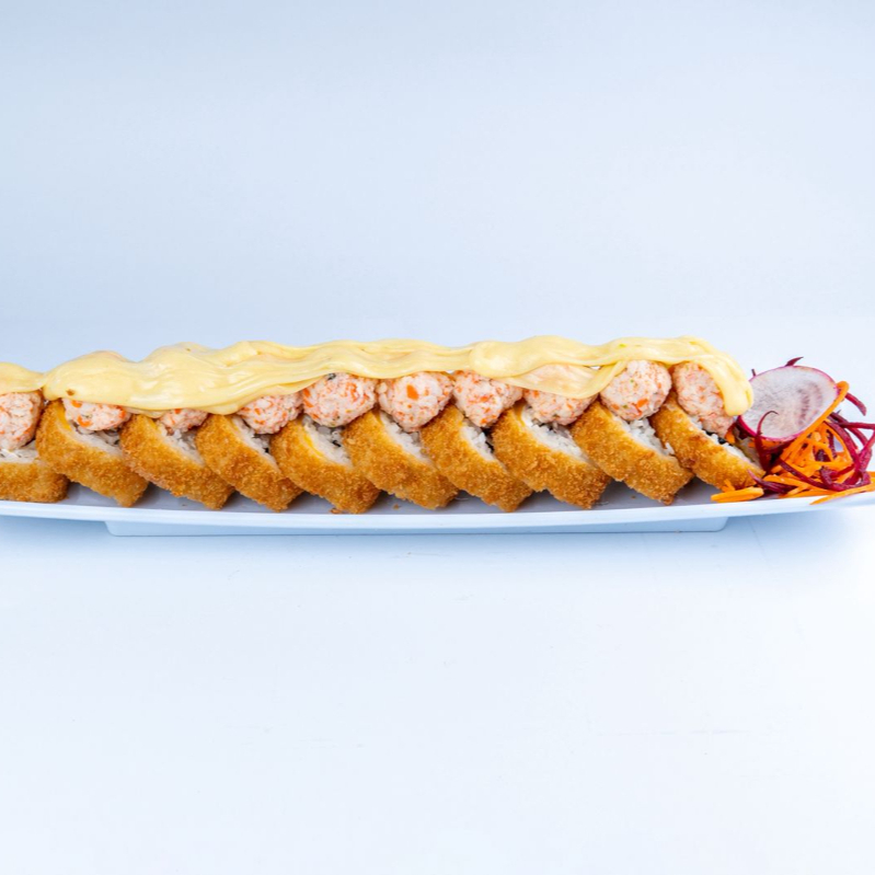 Forrado de queso philadelphia y queso amarillo, relleno de camarón o cangrejo y aguacate con topping de tampico bañado en queso manchego derretido.