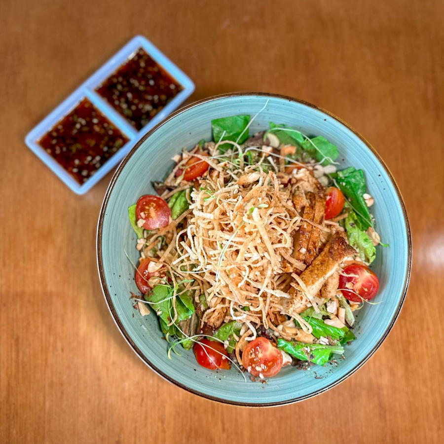 Mix de lechugas, espinaca y tomate cherry con pechuga de pollo teriyaki a la parrilla, salsa de ajonjolí budha, micro brotes de betabel y julianas de wonton crujientes, con nuez de la india, almendra fileteada, acompañada de salsa thai.