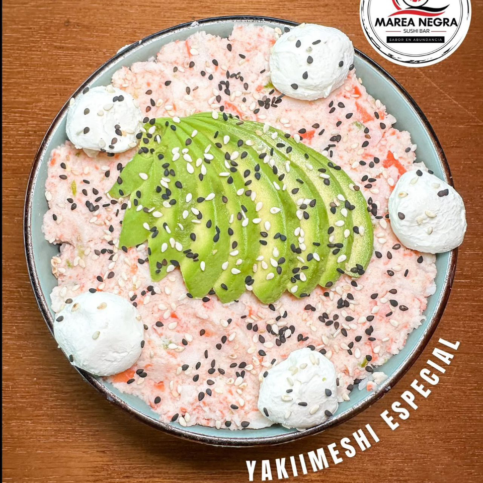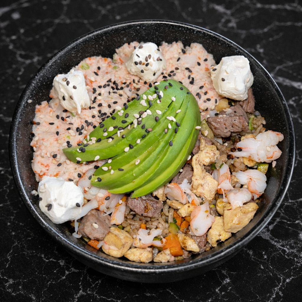 Arroz frito oriental con res, camarón y pollo con tampico, queso philadelphia y aguacate.