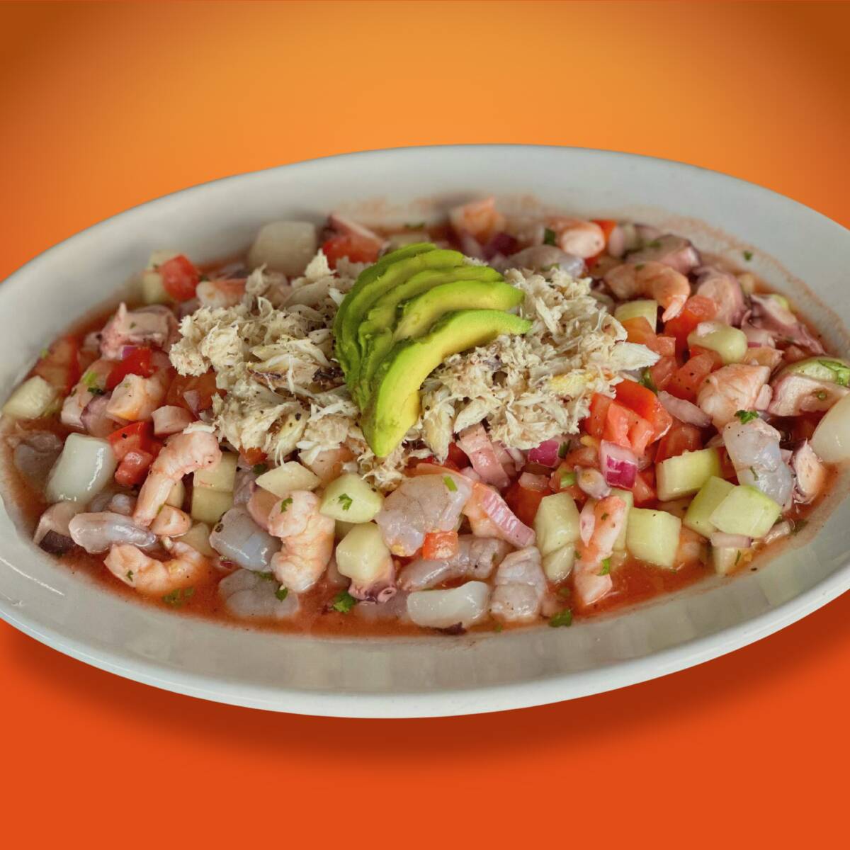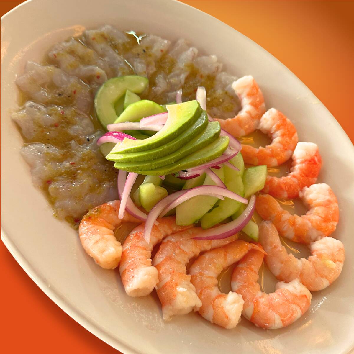 Camarón crudo y cocido en mezcla clásica con salsa aguachile.