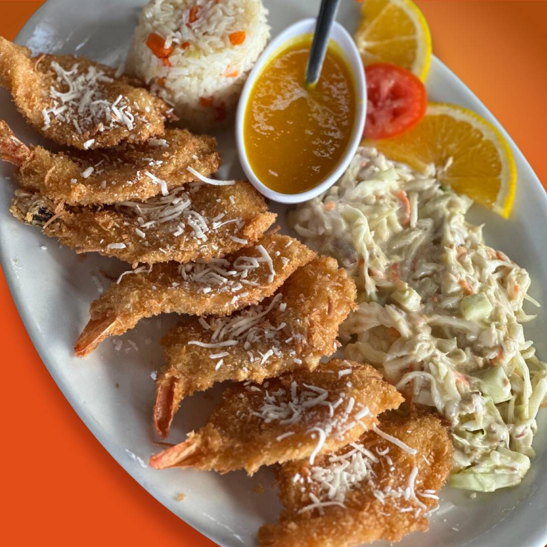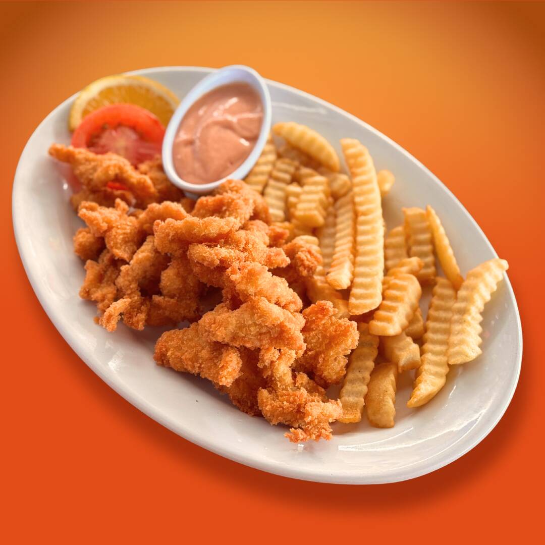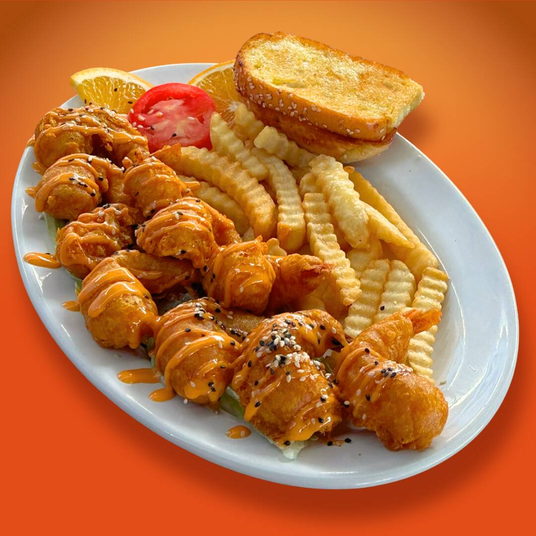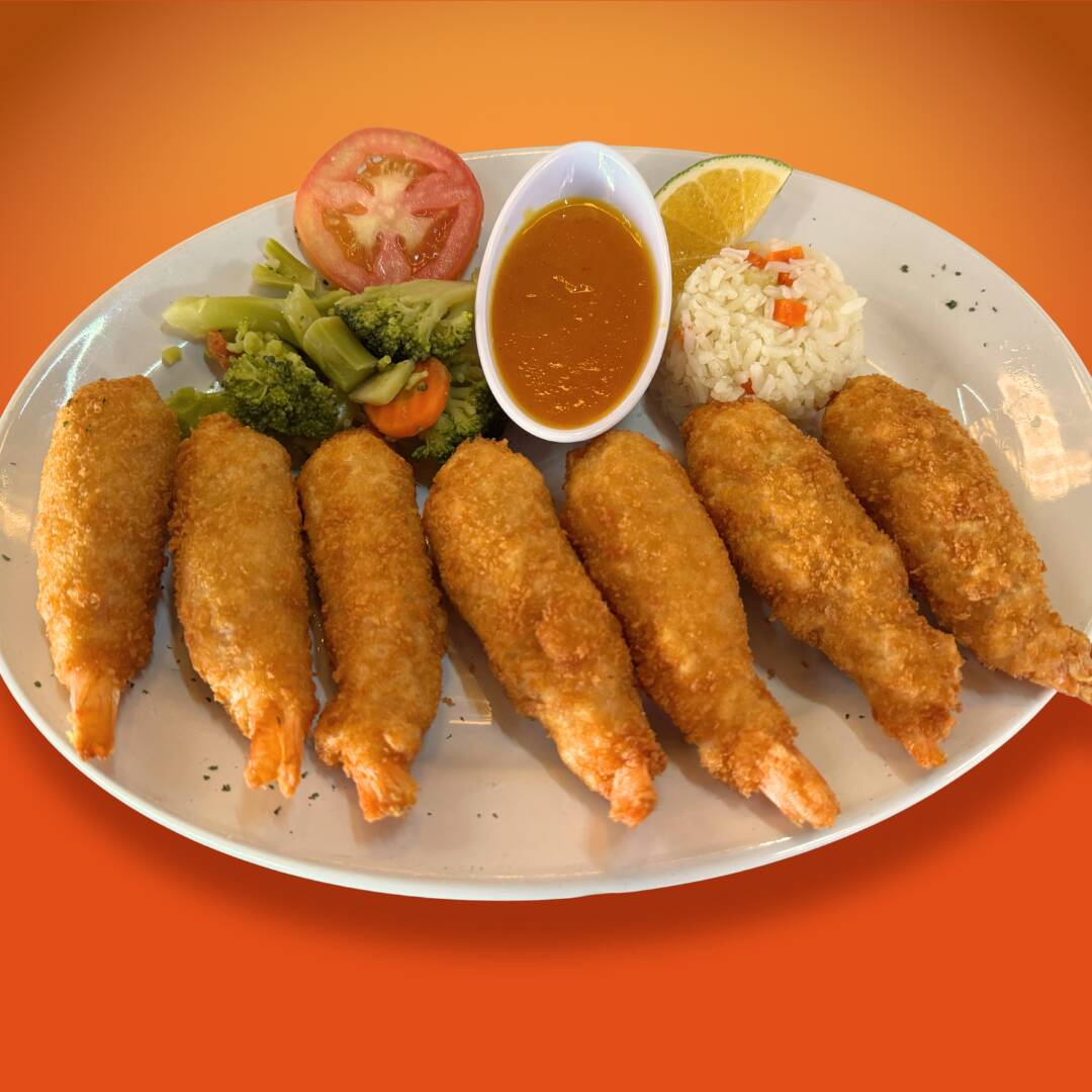 (Camarón ó Pescado) Crujientes y dorados, servidos con aderezos de la casa.