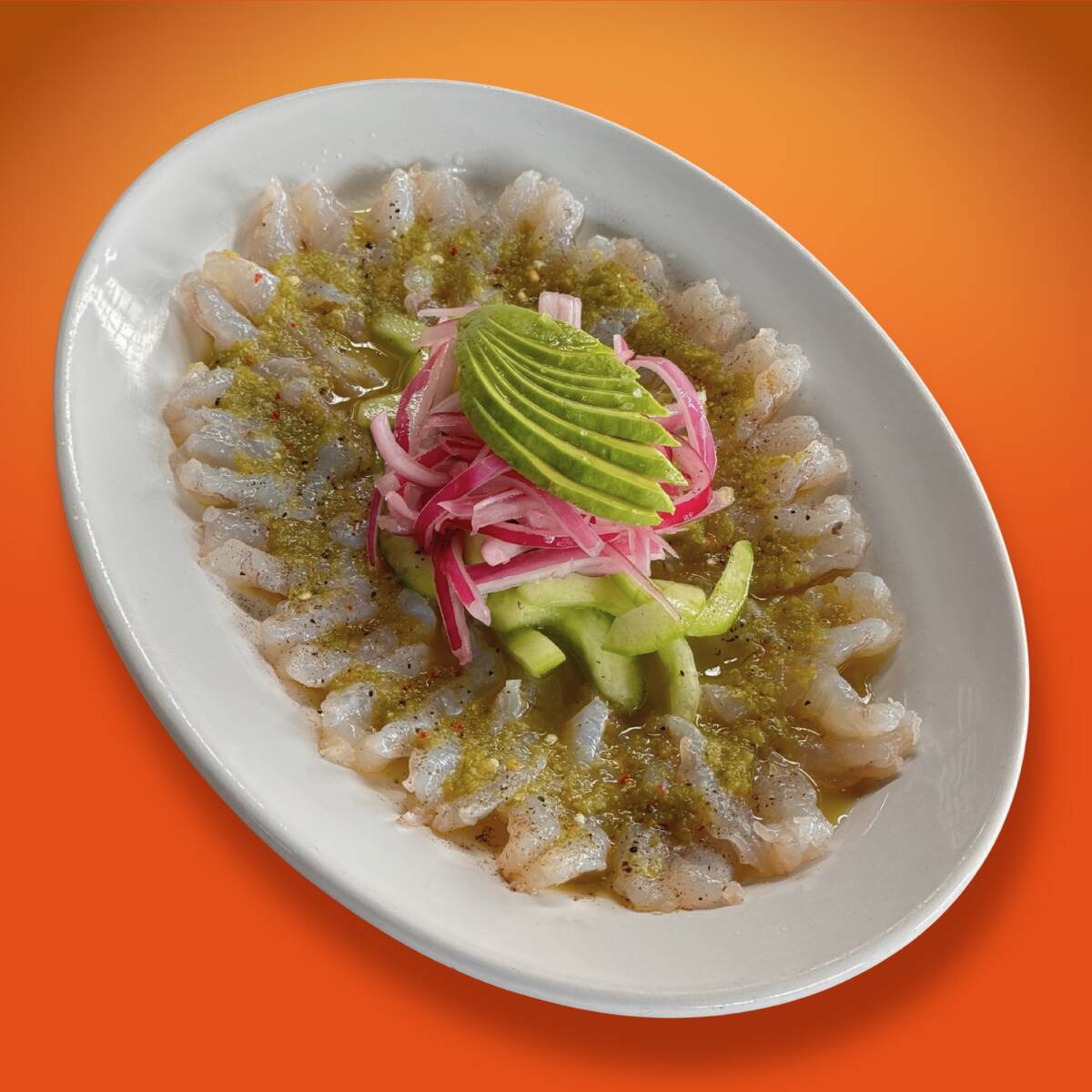 Camarones frescos bañados en la salsa aguachile verde de la casa.