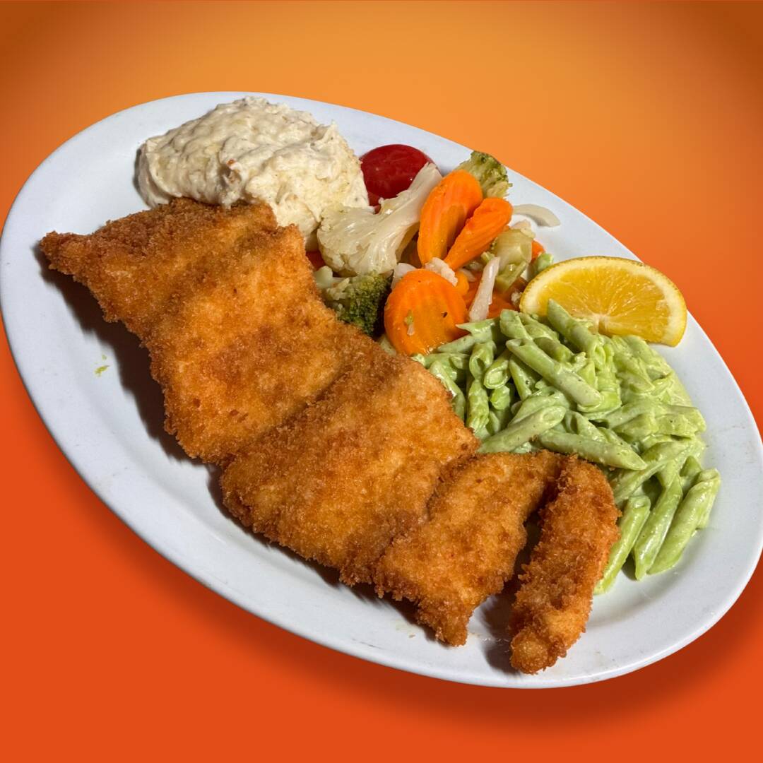 Filete de pescado en trocitos empanizado, crujiente y suave.