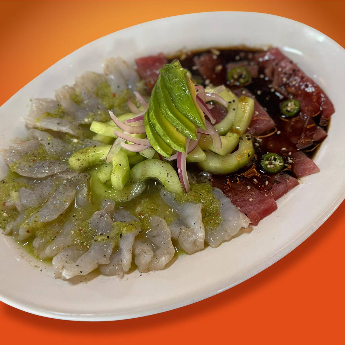 Atún y camarón fresco estilo sashimi bañado en nuestra salsa negra.