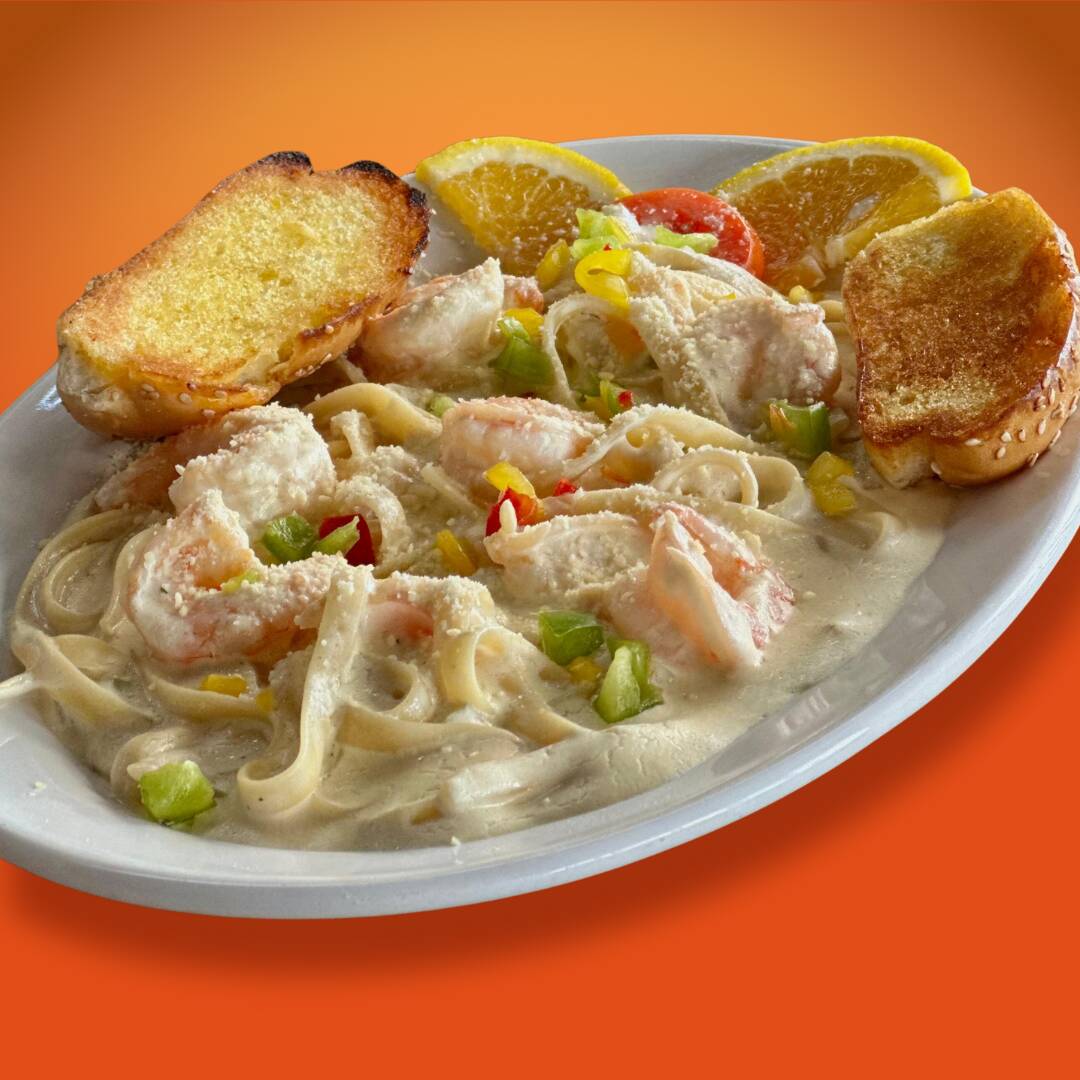 Pasta cremosa al estilo Alfredo con camarones salteados.