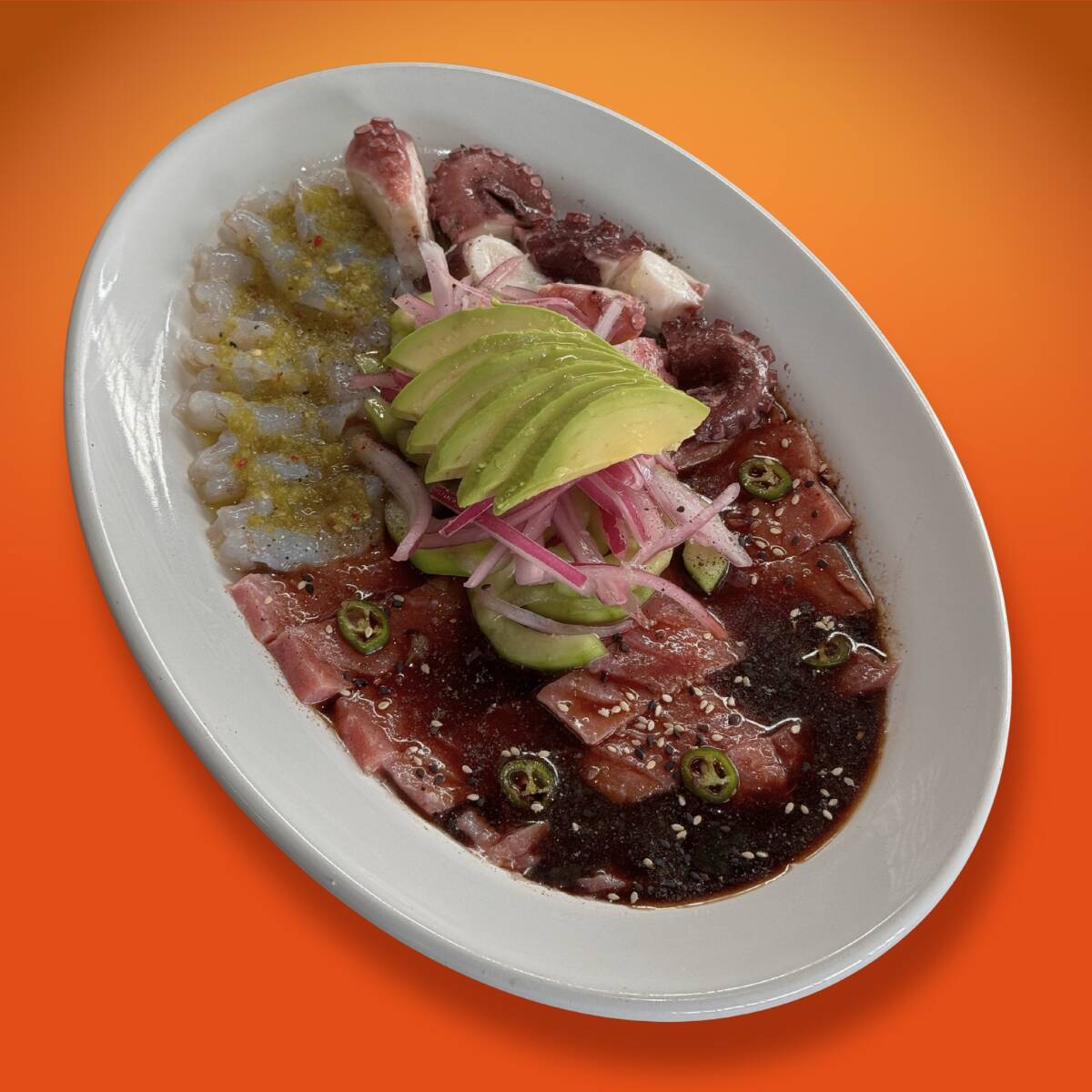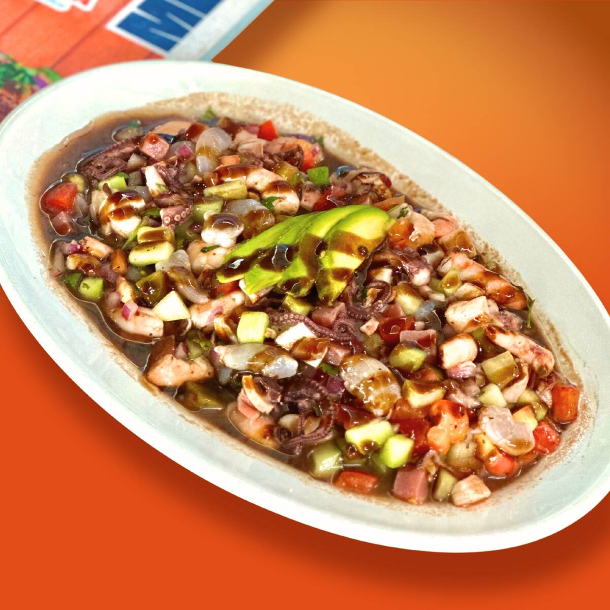 Camarón crudo y cocido, pulpo, atún y pescado en salsa negra exclusiva.