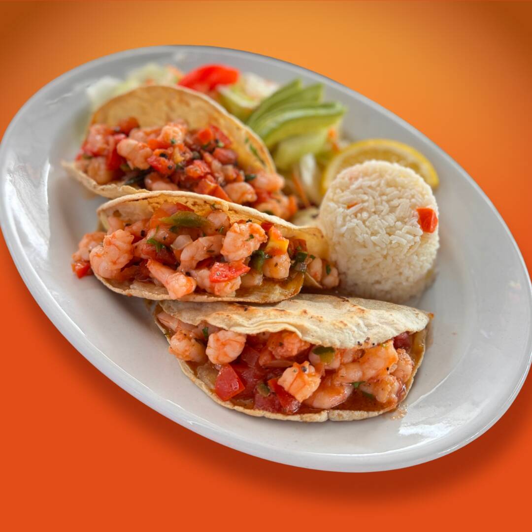 (Camarón ó Marlin) con queso derretido en tortilla de maíz.