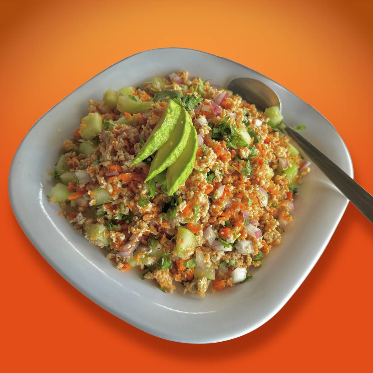 Trozos fritos servidos con ensalada fresca y guacamole.