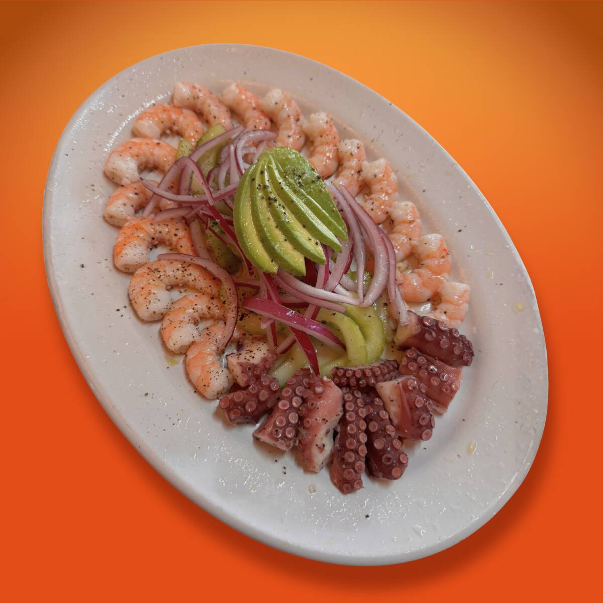 Clásico camarón cocido con pulpo, sal, limón y pimienta.