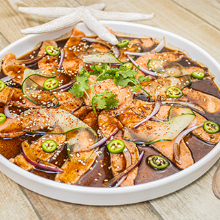 Deliciosas laminas de salmon bañadas con salsa negra de la casa.