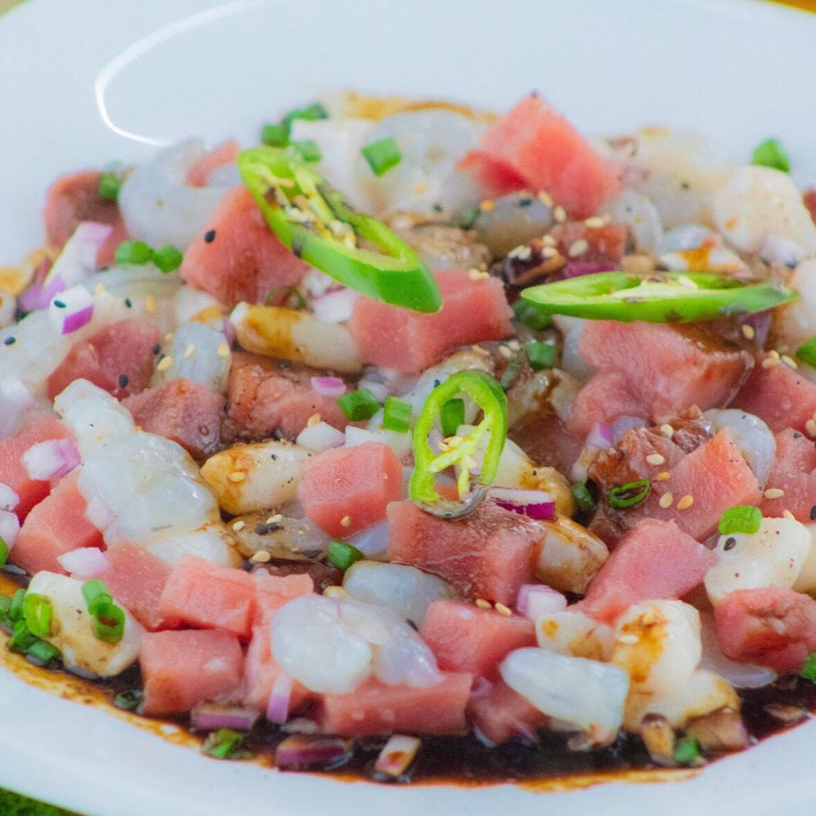 Cubos de atún, callo de almeja con trozos de camarón crudo bañados en salsa negra de la casa.