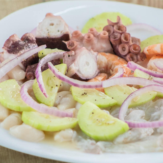 Camarones pelados y pulpo en trozo con pepino, cebolla morada, limón y sal pimienta.