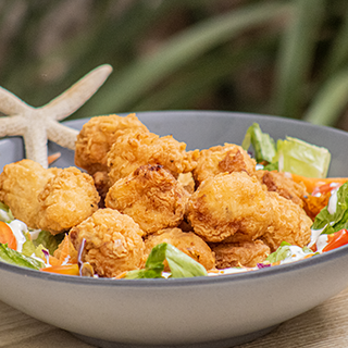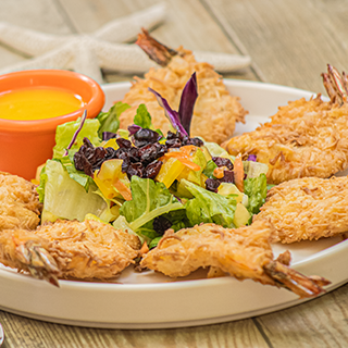 Camarones empanizados con coco (6 pz) acompañados de ensalada tropical y delicioso aderezo de mango.