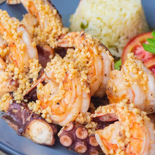 Deliciosos camarones U15 con pulpo en trozos salteados en mantequilla y ajo, acompañados con arroz y ensalada verde.