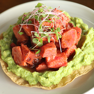 Cubos de atún rojo aderezado con mermelada de chile morita montado sobre una cama de pure de aguacate.