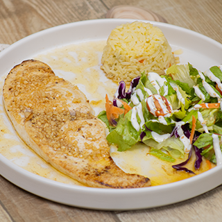 Filete de pesca del dia bañado con una cremosa salsa de 3 quesos, acompañado de arroz y ensalada verde.