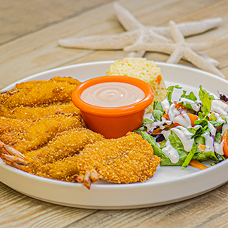 Camarones Empanizados U15 (6 pz), acompañados de arroz y ensalada fresca. Aderezo Mil islas.