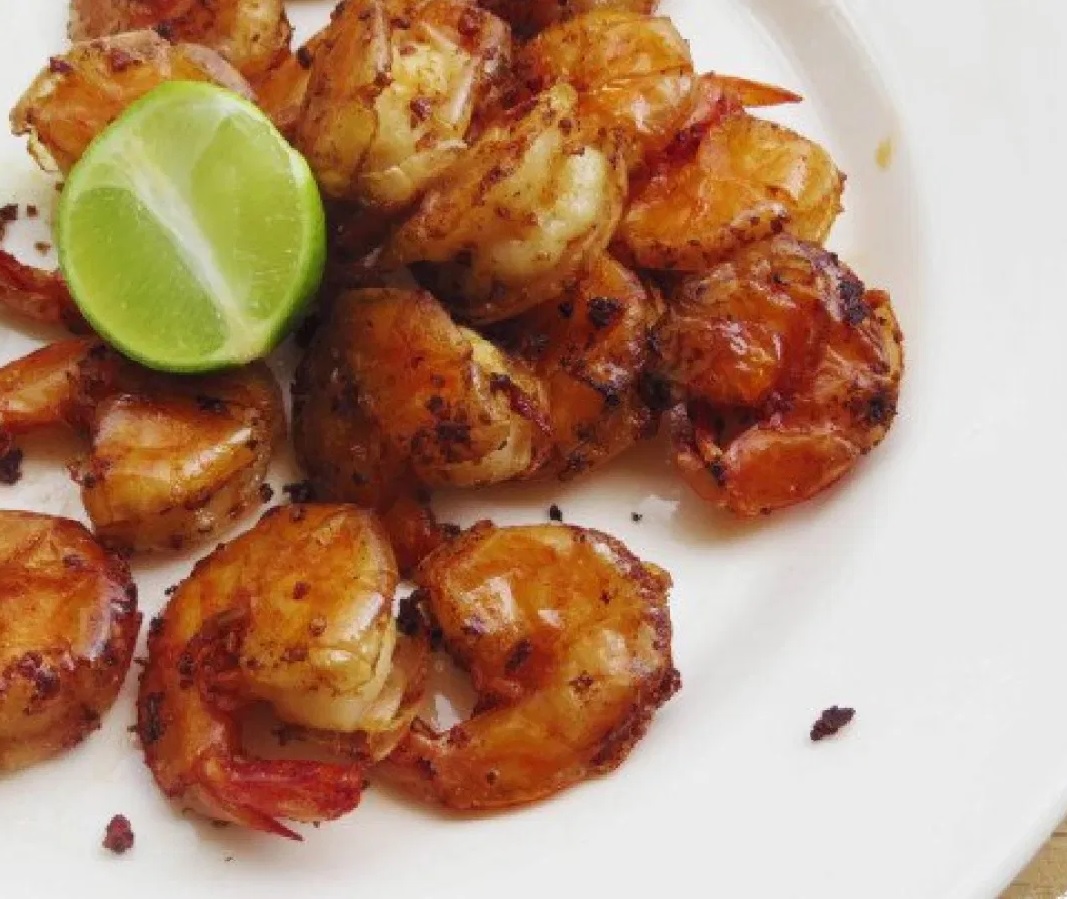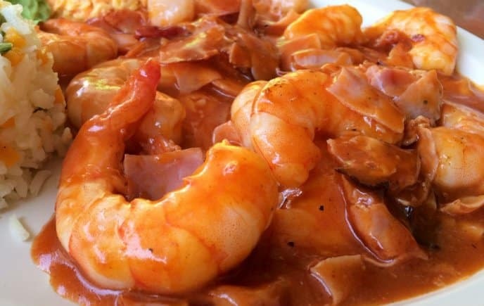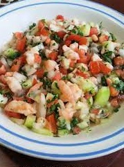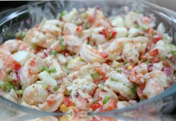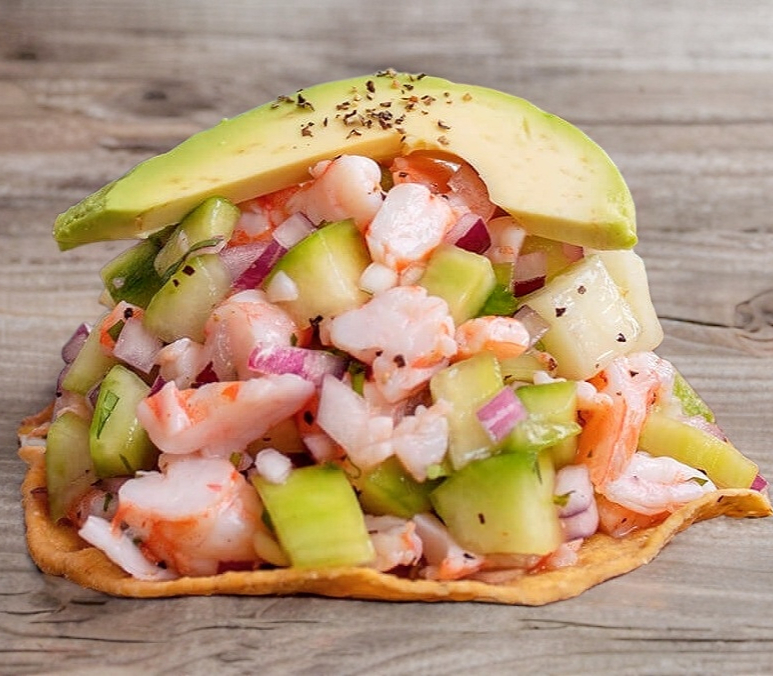 Camarón cocido, cebolla, pepino y caldo frío o caliente.