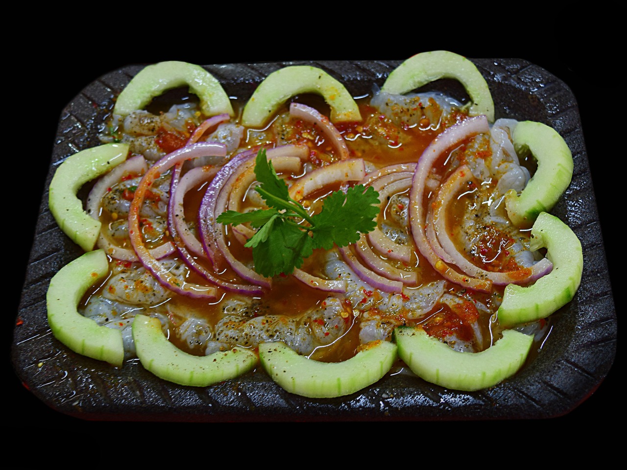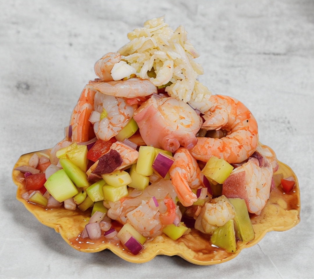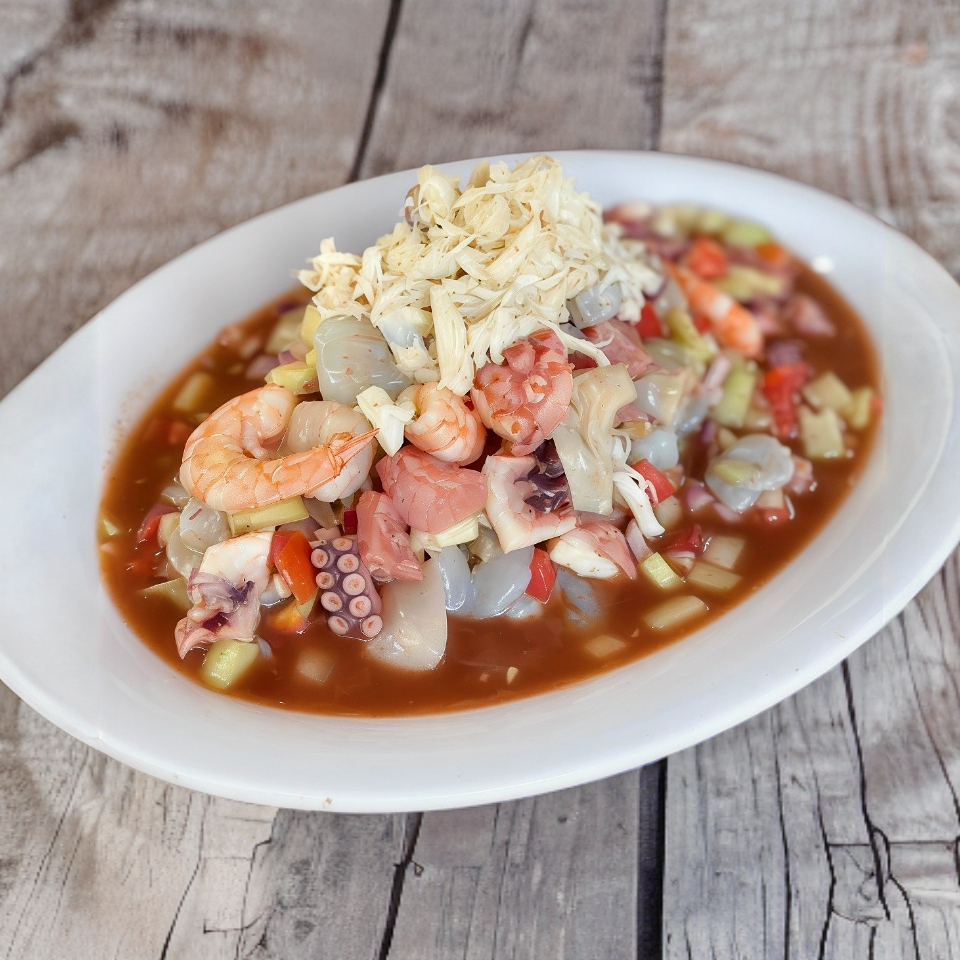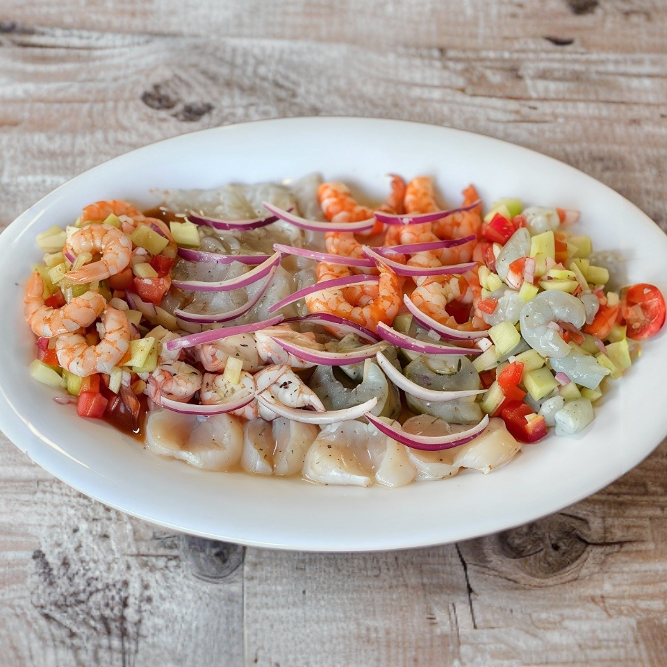 Camarón crudo, camarón cocido, pulpo, caracol, cayitos preparados con tomate, cebolla y cilantro.