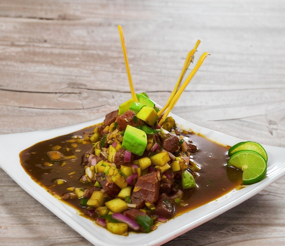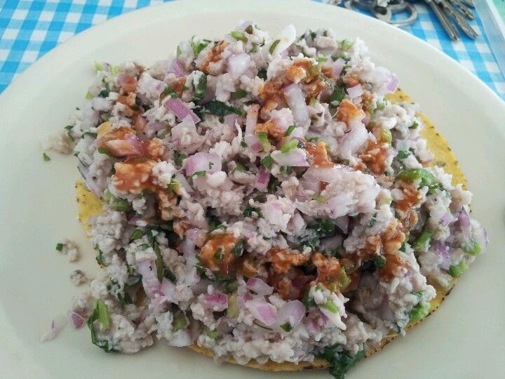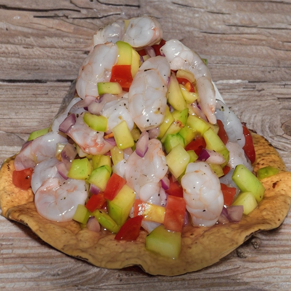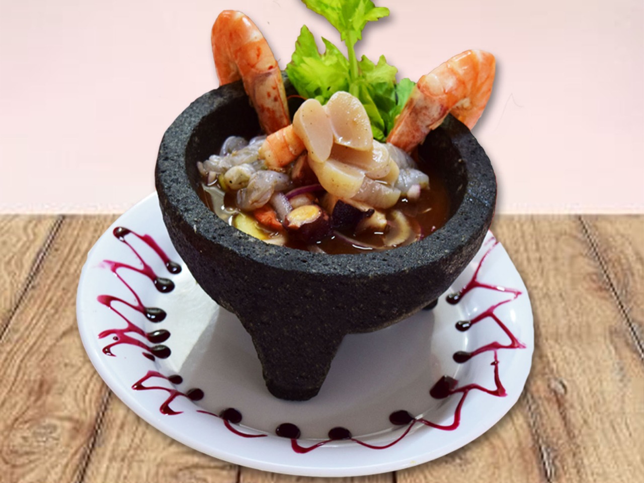 Camarón crudo, camarón cocido, pulpo, caracol, cayitos preparados con tomate, cebolla y cilantro.