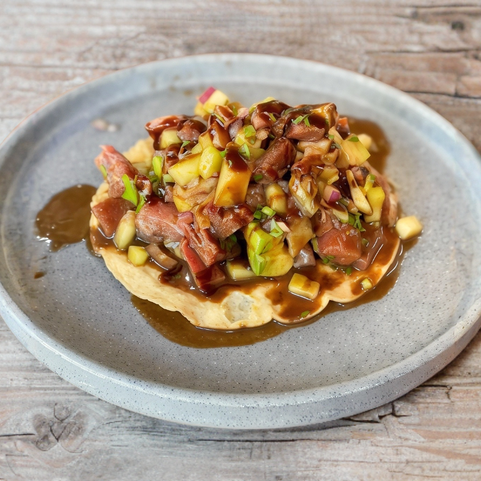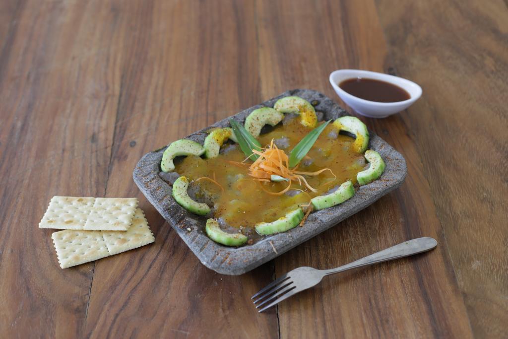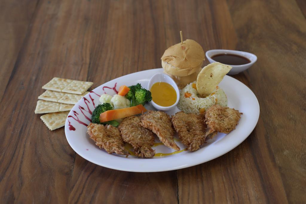 Camarones rellenos de queso philadelphia, jamón 210 empanizados y acompañado de salsa de mango.