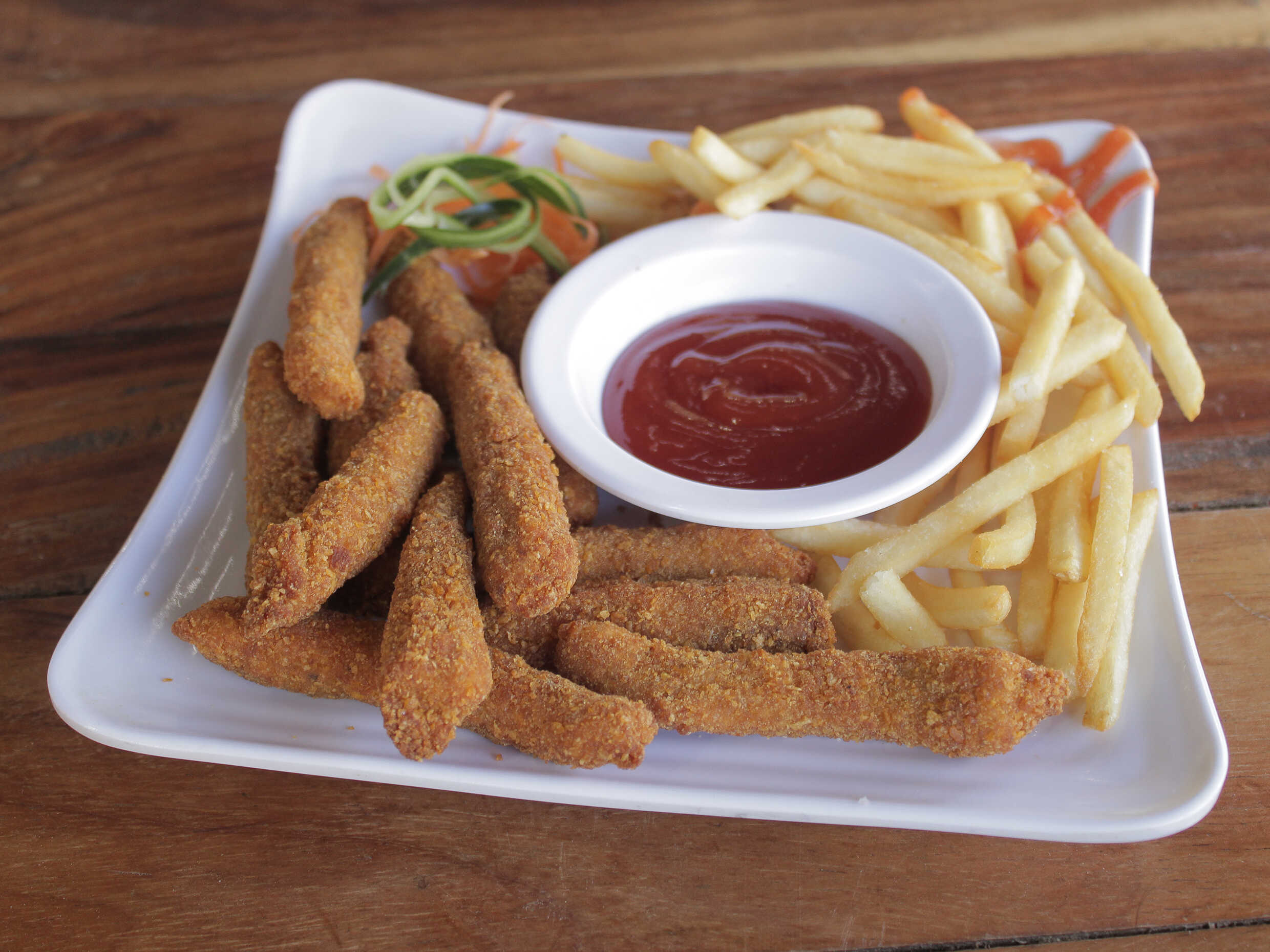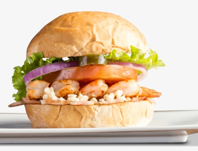 Camarón, queso americano, lechuga, tomate y cebolla, acompañada de papas a la francesa.