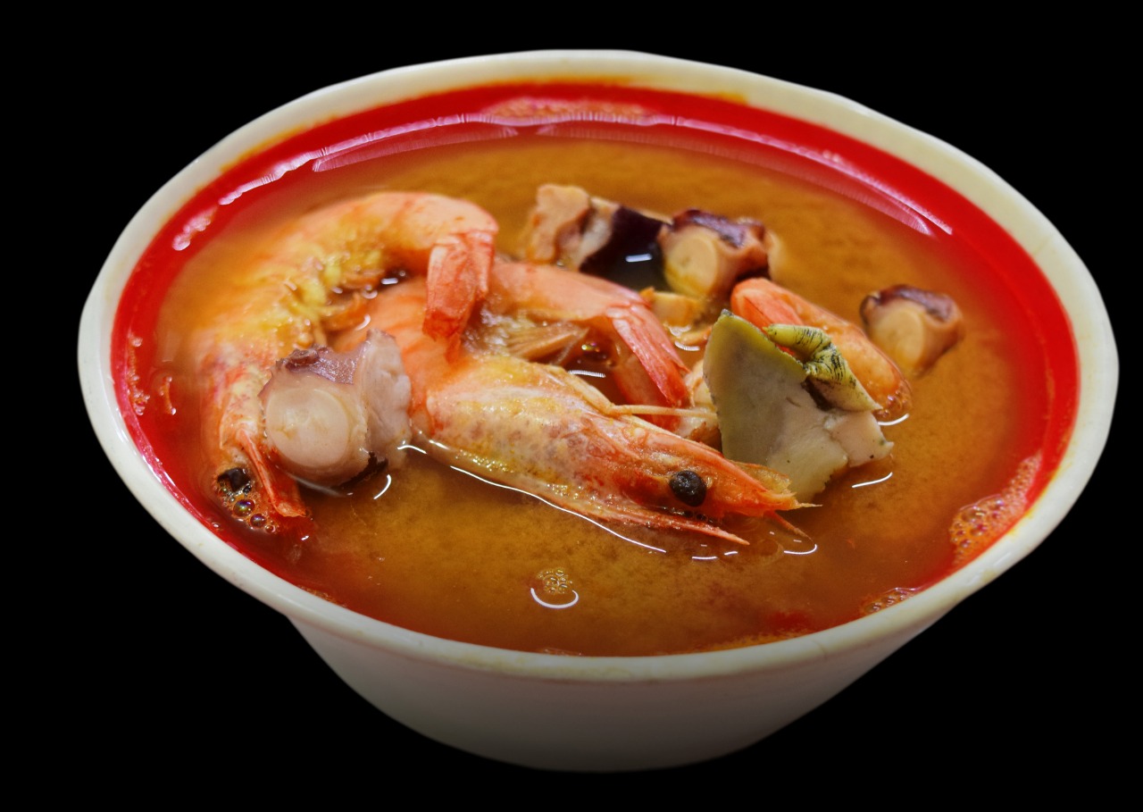 Camarón, pulpo, caracol cocido y callo de almeja con caldo frío o caliente.