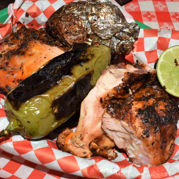 Pollo asado a las brasas acompañado de salsa, ensalada, cebolla, tortillas y chile toreado..