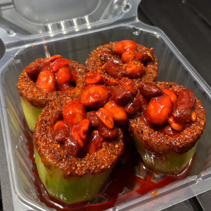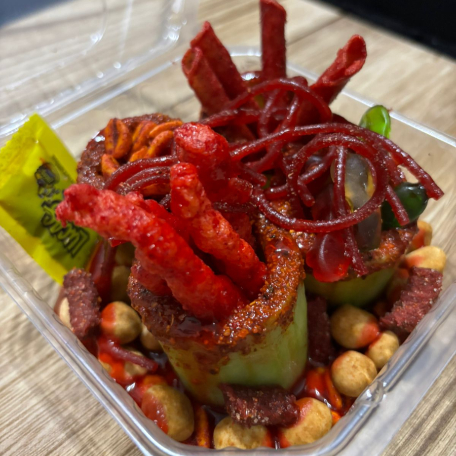 Pepino escarchado, takis morados, cacahuate, cacahuate enchiloso, chaca chaca, gomitas y skwinkles.