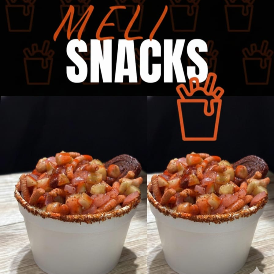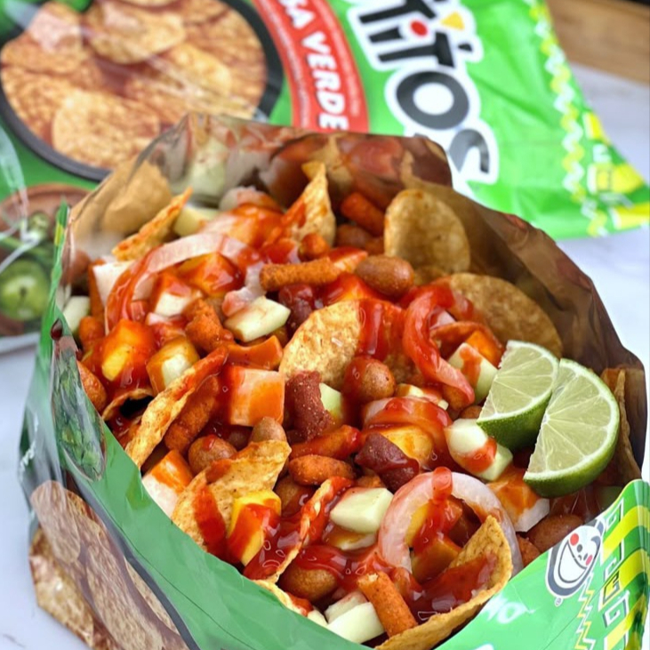Tostitos, cacahuate, pepino, chaca chaca, cueritos, zanahoria, clamato, banderilla enchilosa y gomitas enchilosas.