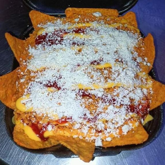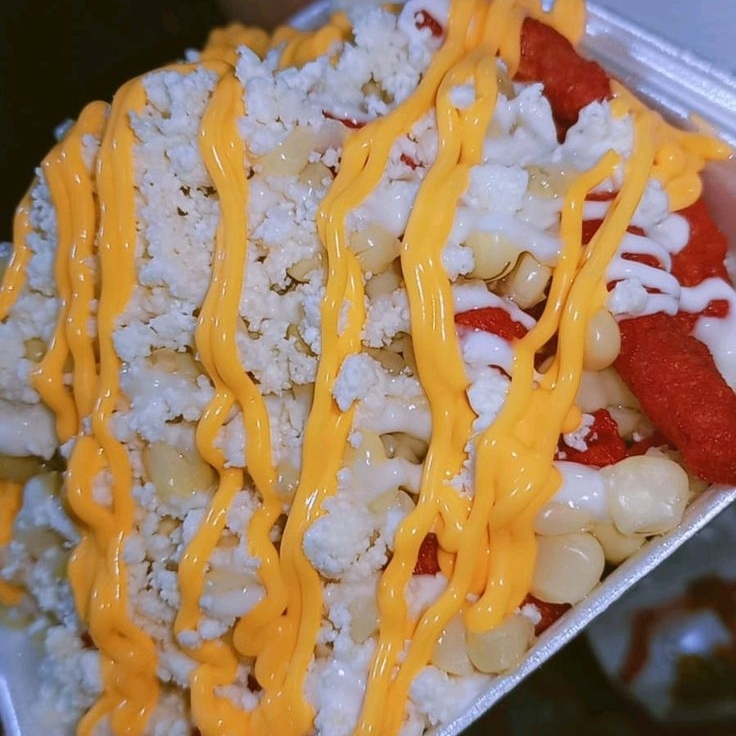 Elote, doritos rojos, queso rallado, crema, mayonesa, queso amarillo.
