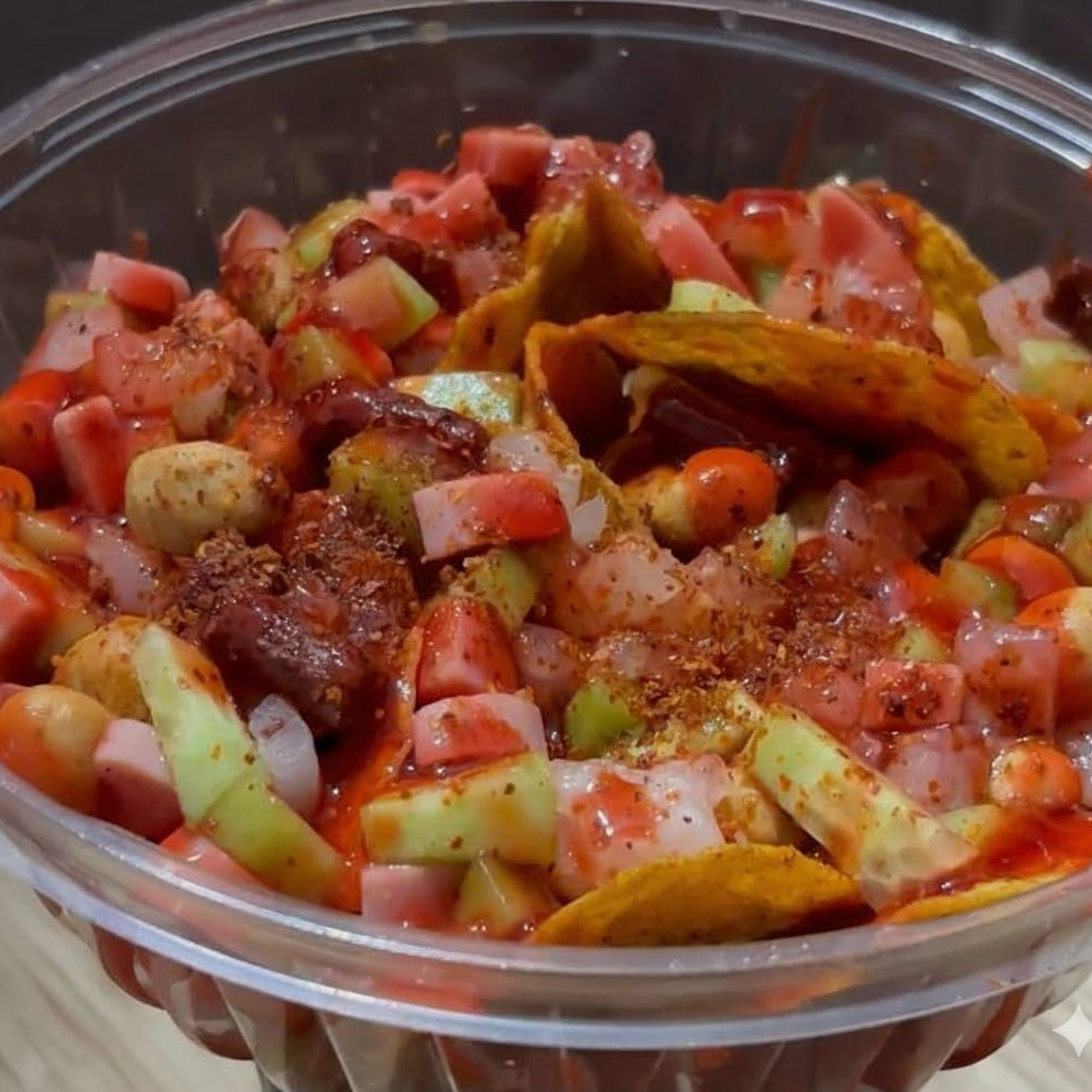 Tostito, pepino, cacahuate, chaca chaca, cueritos, salsas.
