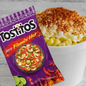 Elote, tostitos famin hot, queso rallado, crema, mayonesa y queso amarillo
