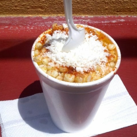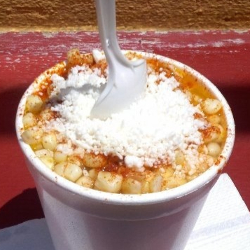 Elote, queso amarillo, mayonesa, queso rayado, y crema