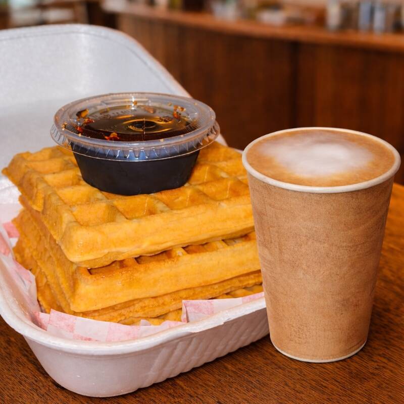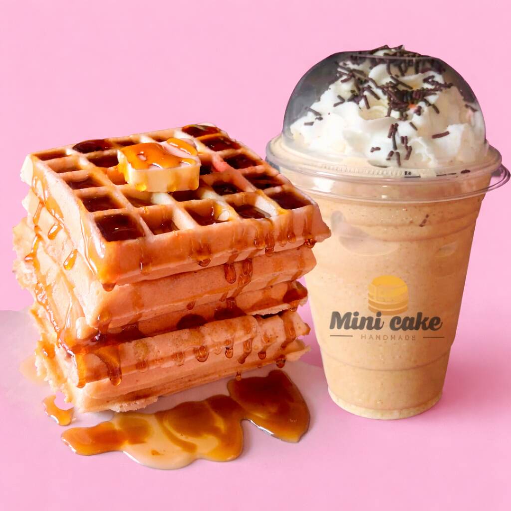 El combo incluye 4 deliciosos waffles acompañados de miel maple y café cappuccino.