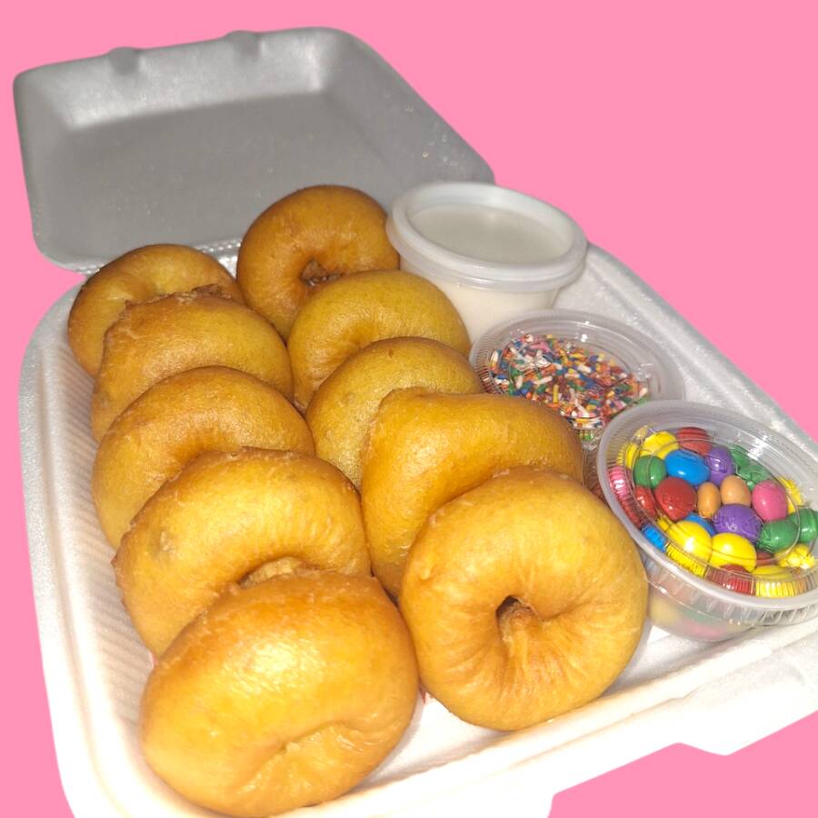 Son 10 mini donas preparadas al momento decoradas. Toppings a elegir: -Lechera -Cajeta -Nutella -Mermelada de zarzamora -Hershey´s Decorado: Chispas de colores -Chispas de chocolate -Nuez -
