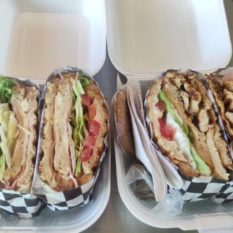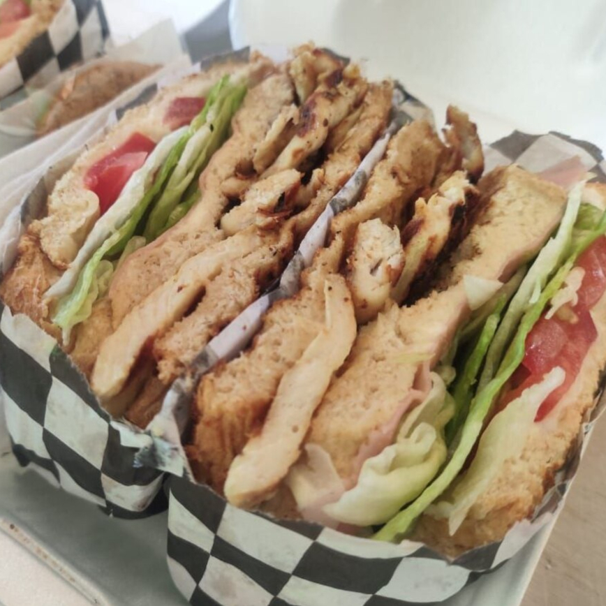3 capas de pan integral del Panamá ,pollo a la plancha ,jamón,queso,lechuga,tomate,mayonesa ,y tostado