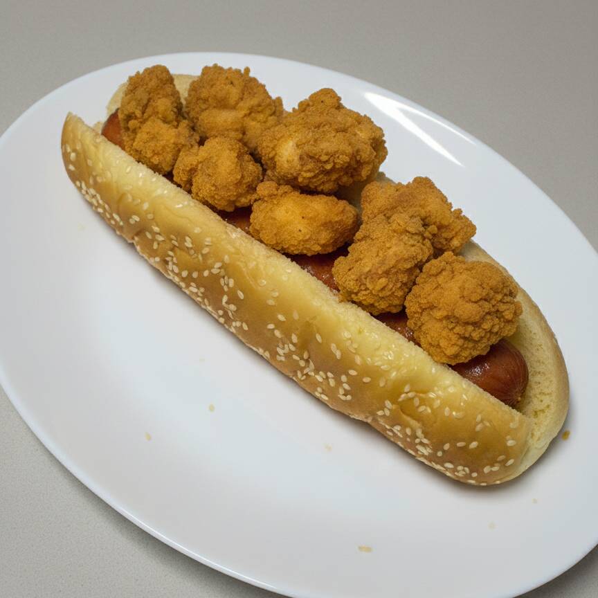 Pan, salchicha más boneless encima.