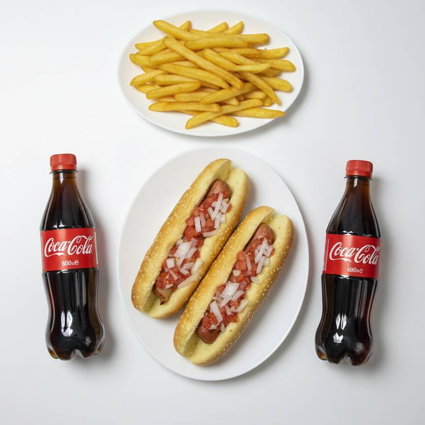 Dos deliciosos hot dogs de calidad premium con una orden de papas y refresco