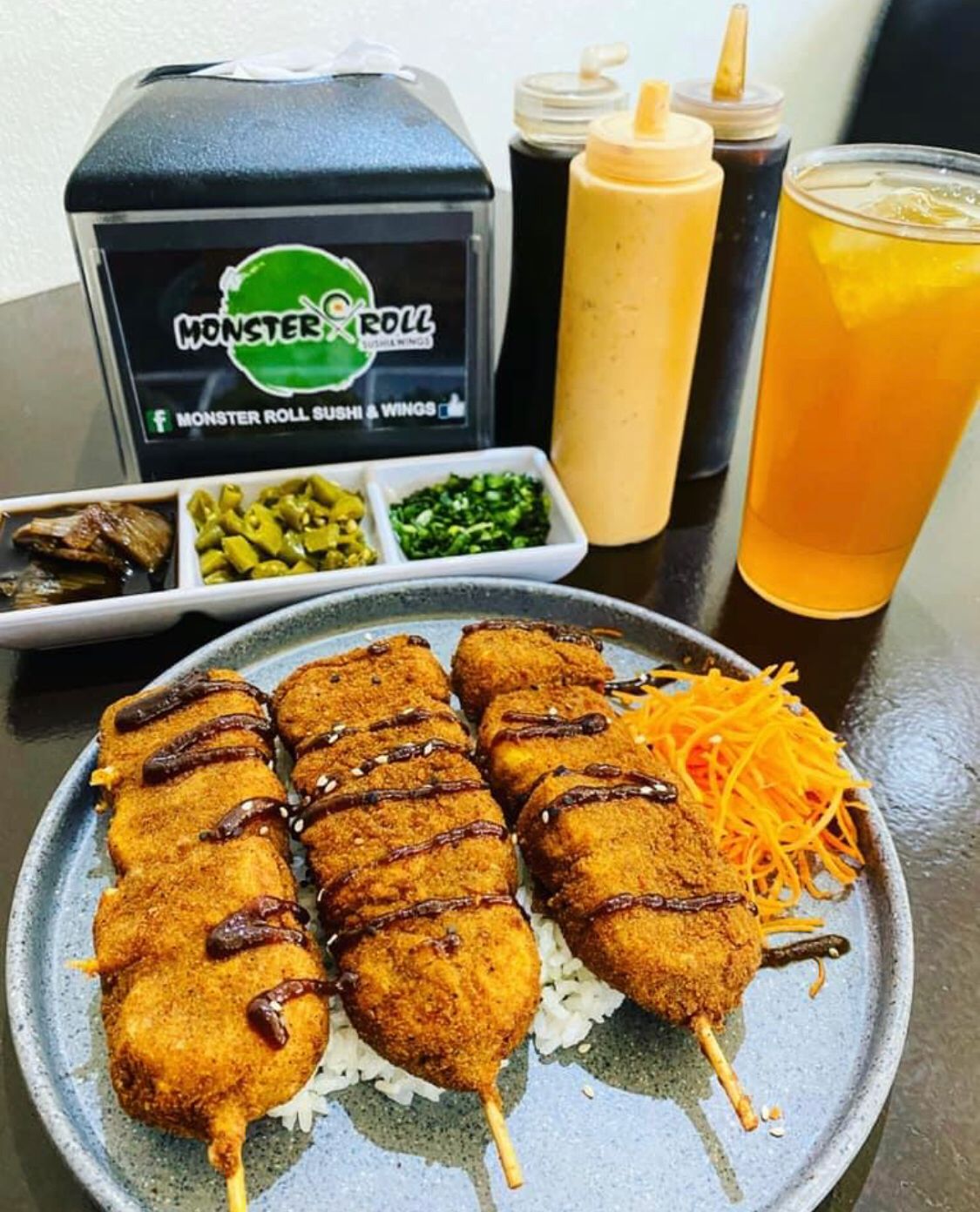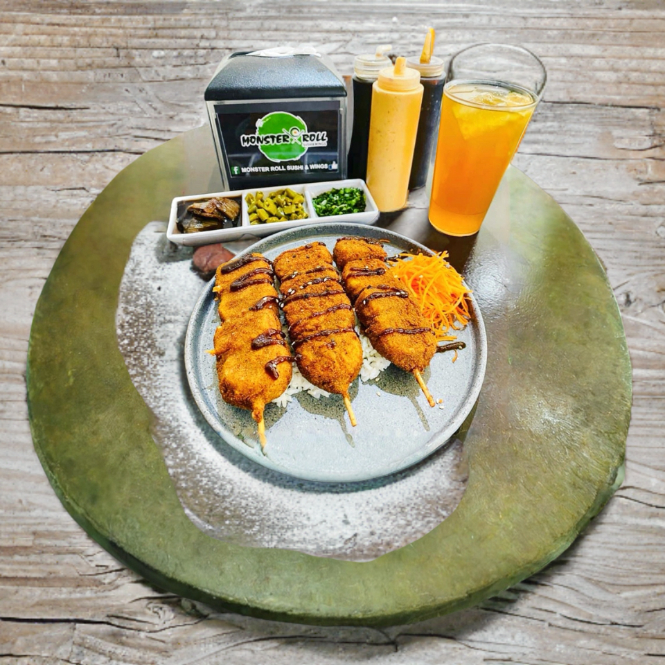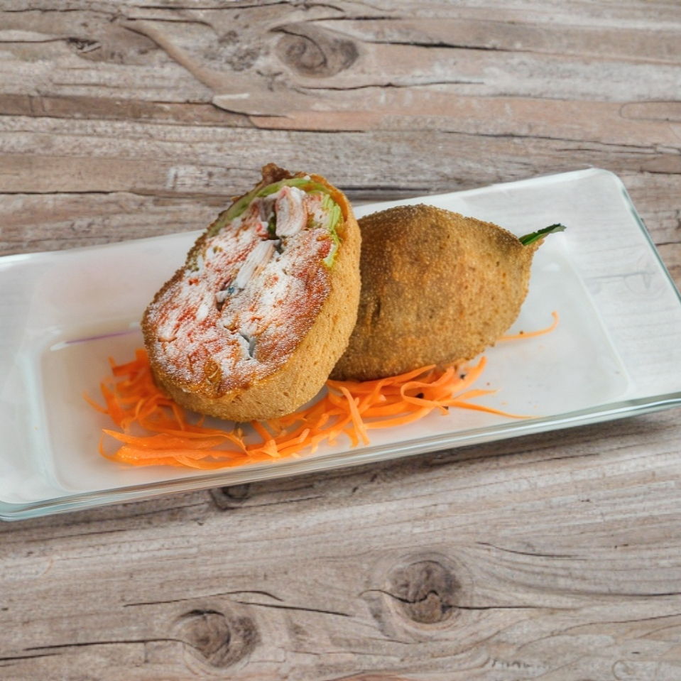 5 Camarones empanizados rellenos de philadelphia con spicy de kanikama y cebollín; servidos sobre cama de arroz blanco.