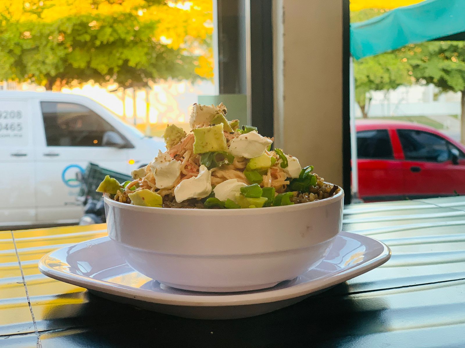 Arroz blanco con philadelphia y tampico; encima topping especial de carne, queso gouda, y tocino; coronado con trozos de aguacate y bañado en salsa anguila y ajonjolí.
