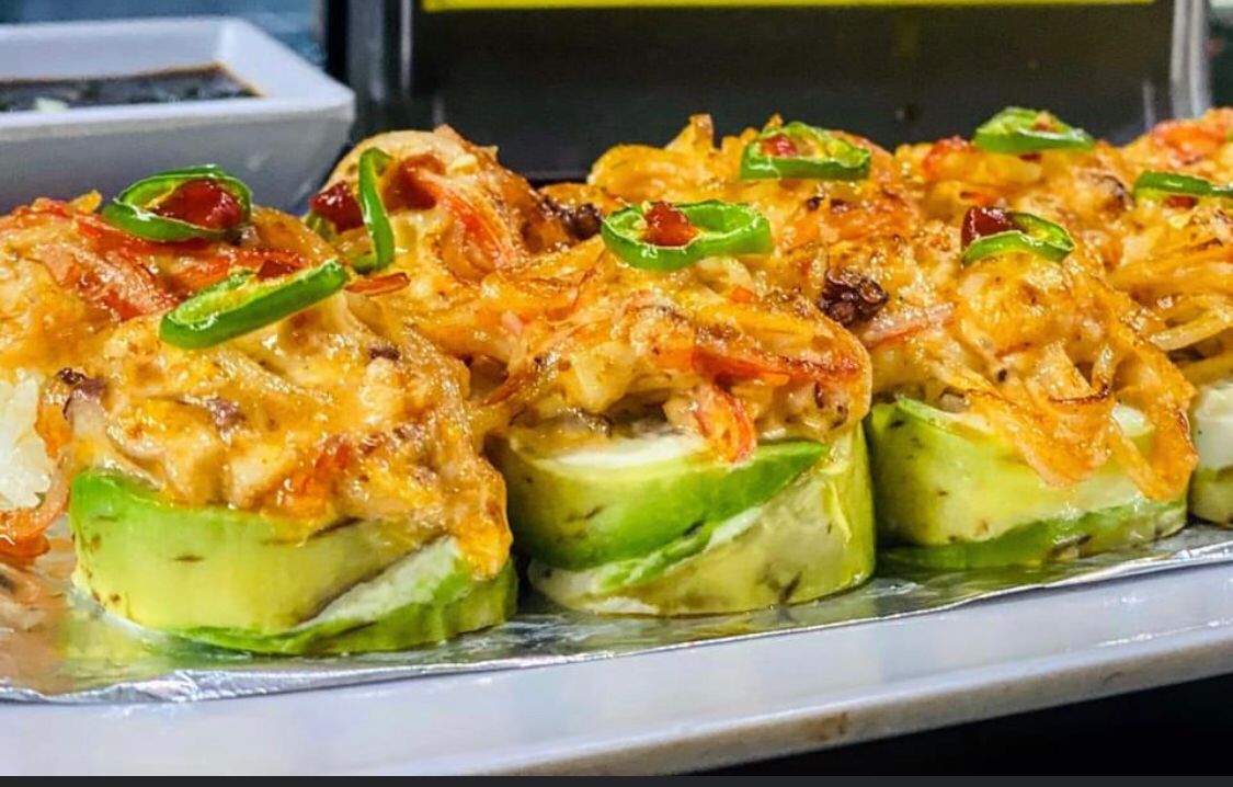 Philadelphia, camarón, tampico, pepino y aguacate adentro; con un topping especial de 2 quesos, camarón y tocino.
