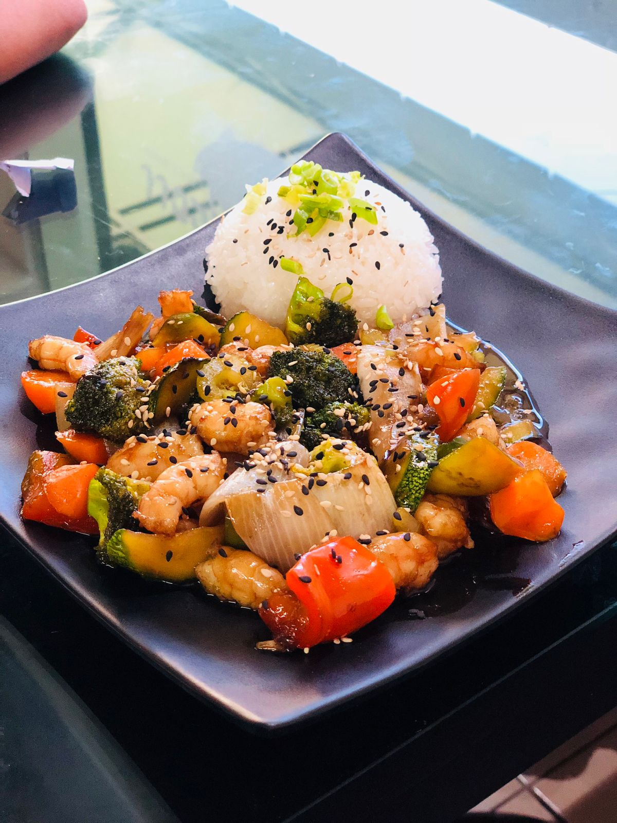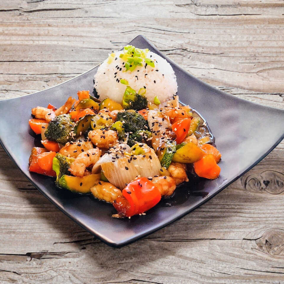 Deliciosa costillas de puerco en trozo, preparados con chile morrón, zanahoria, calabaza, brócoli, apio y cebolla; preparadas en salsa de ostión y acompañadas con arroz blanco.