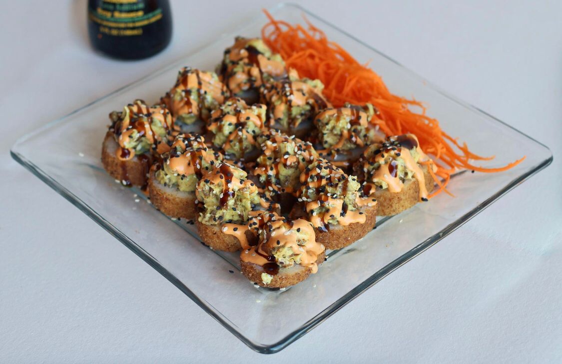 Arroz frito con carne, camarón, calabaza y zanahoria; encima philadelphia, tampico, aguacate y trozos de camarón empanizado; bañado en salsa de anguila y ajonjolí.