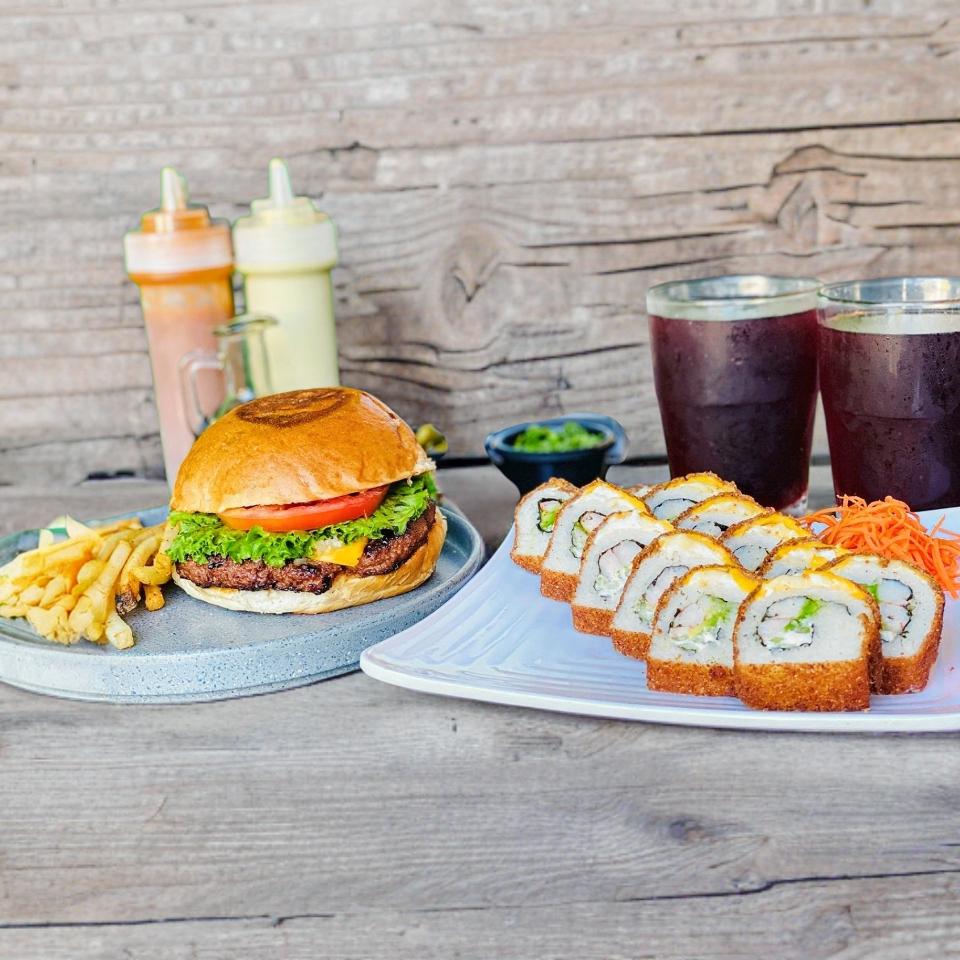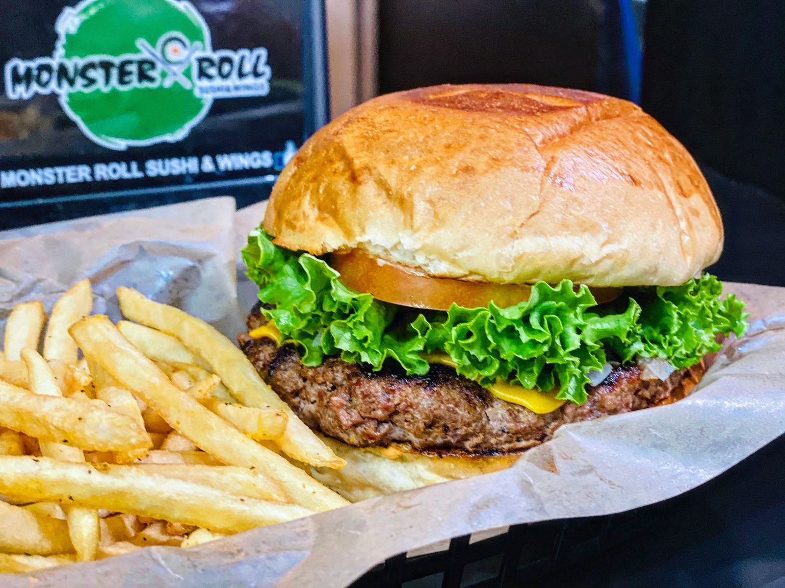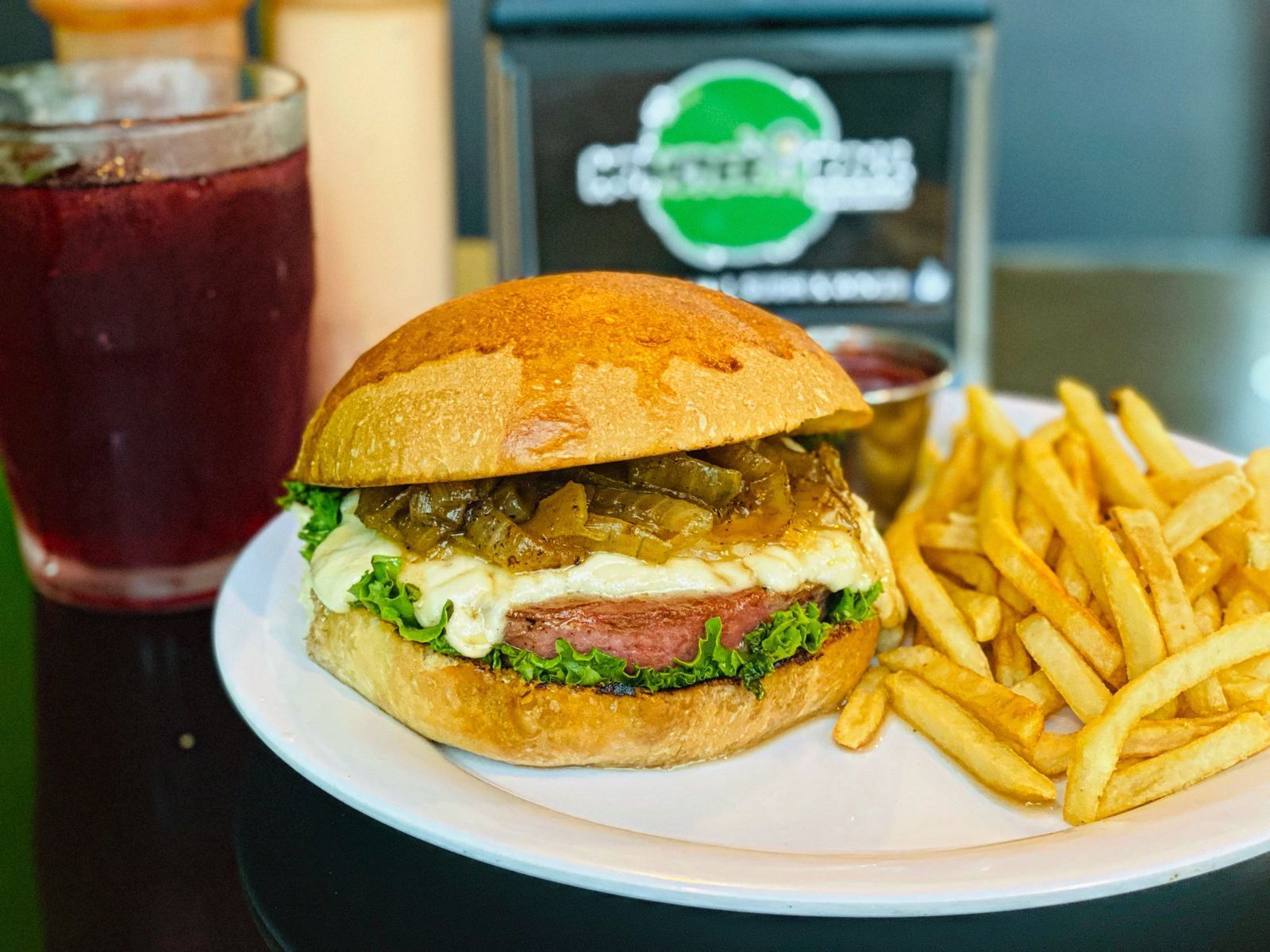 Pan brioche, medallón de atún, aderezo de cilantro y aderezo de chipotle especial, queso manchego, cebolla picada, lechuga, y cebolla caramelizada. INCLUYE PAPAS A LA FRANCESA