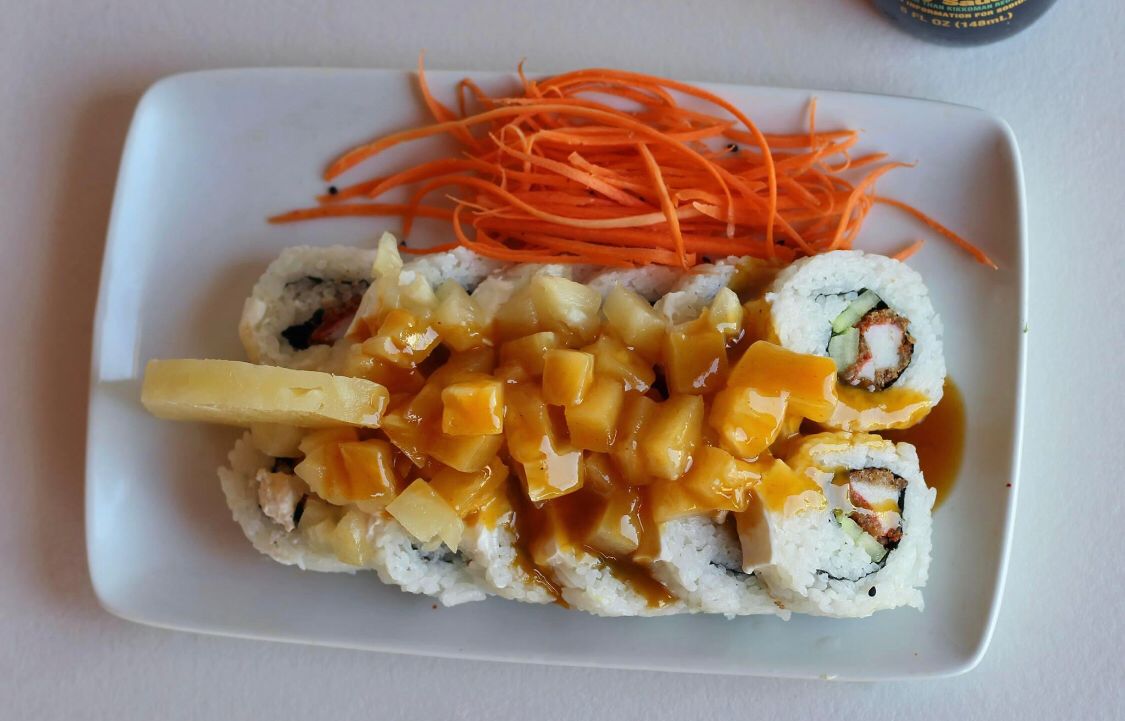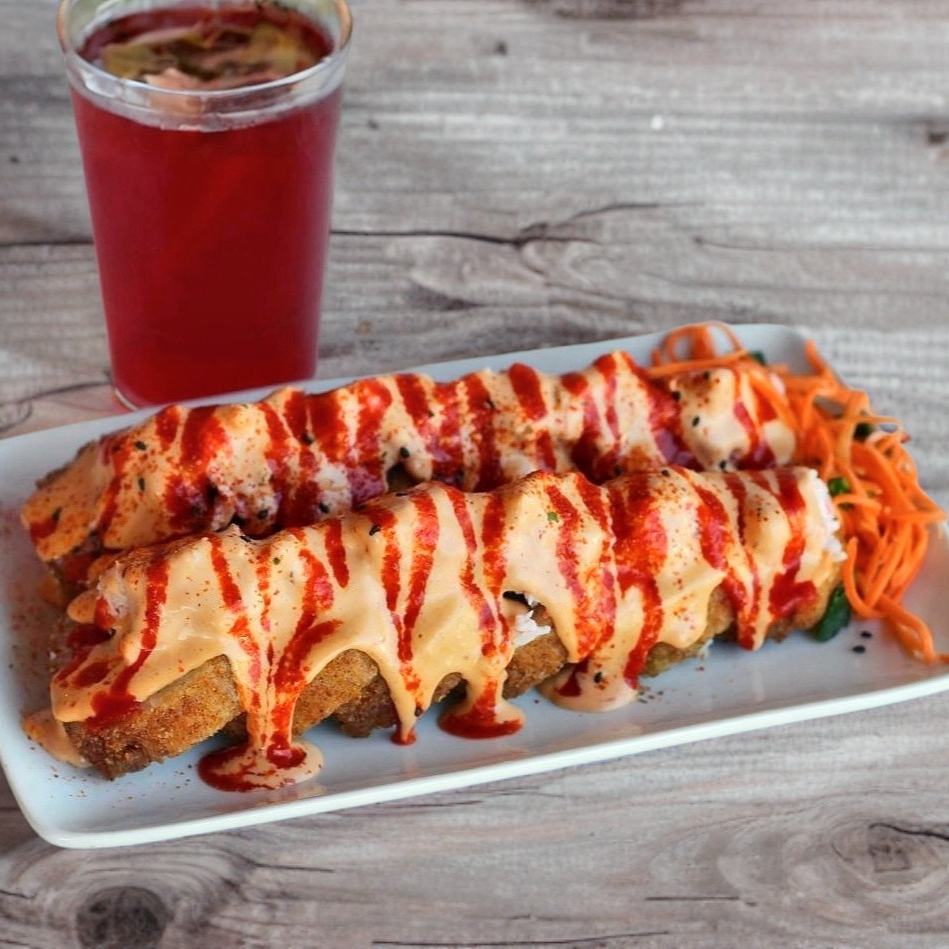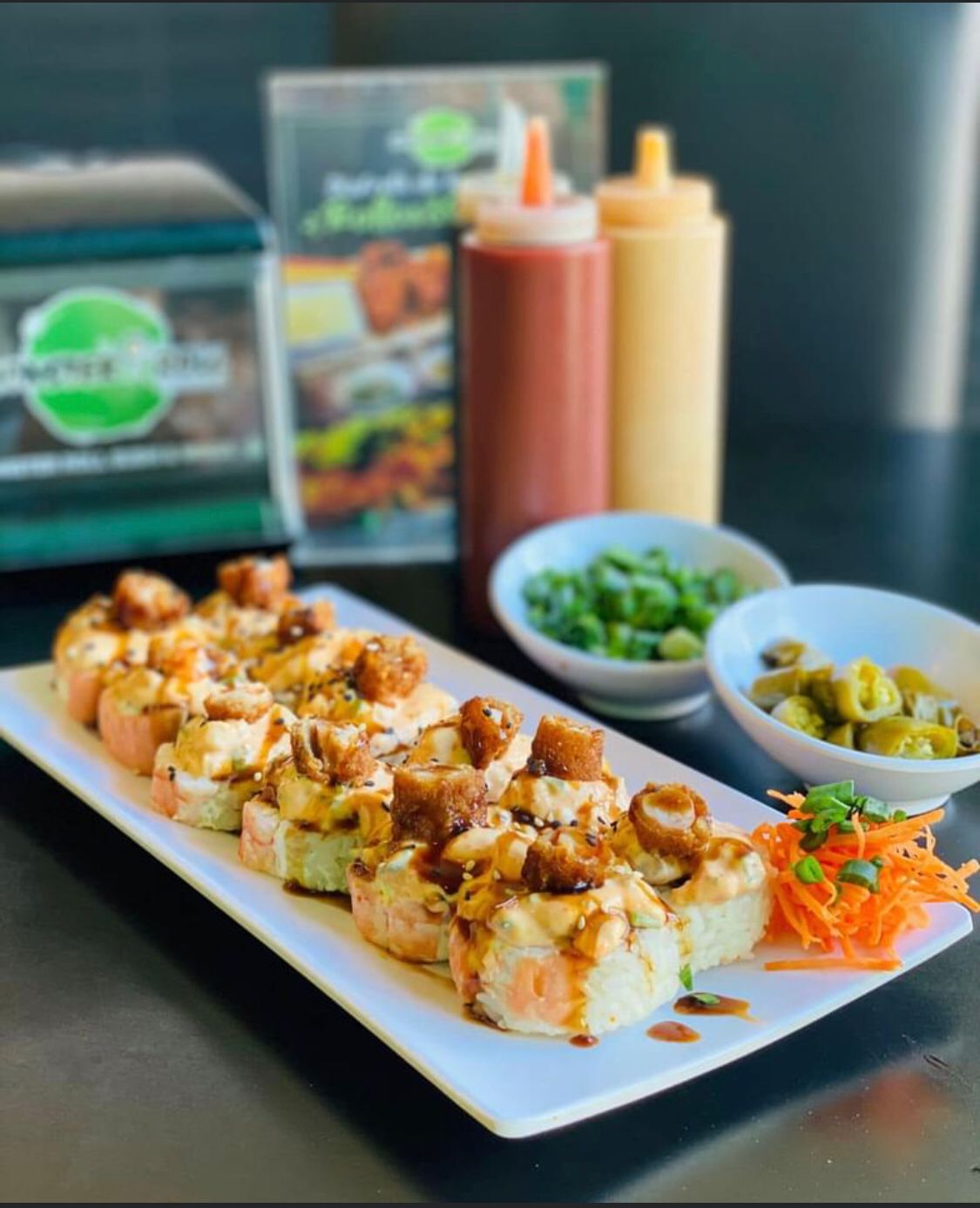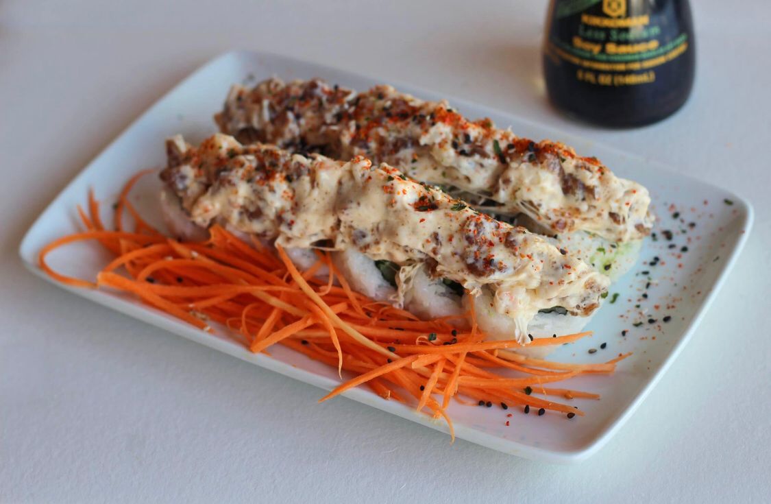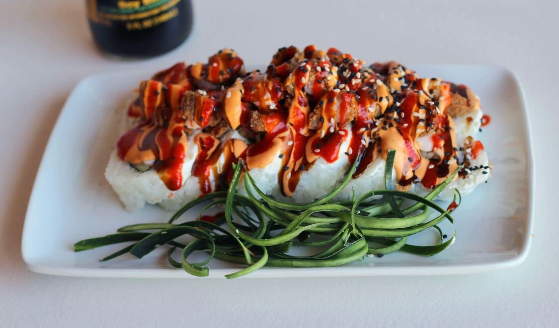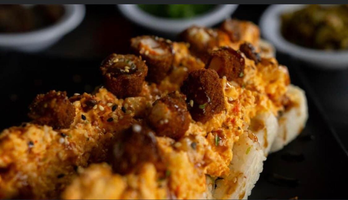 Philadelphia, camarón, pepino y aguacate; encima tampico y bañado en aderezo de la casa sirasha y sishimi.