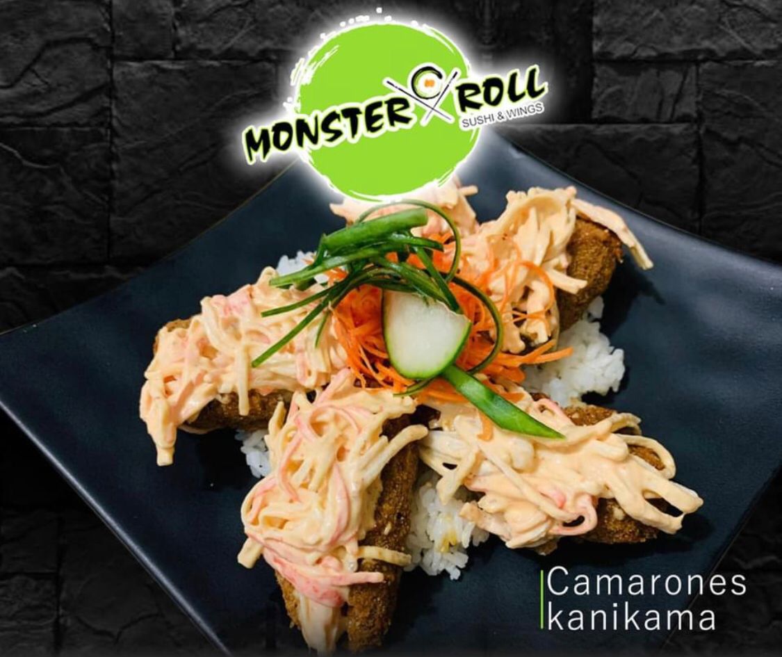 Philadelphia, pepino y camarón adentro; por fuera camarón; encima spicy de camarón, pulpo, callo y cebollín; coronado con camarón empanizado; bañado en salsa de anguila.