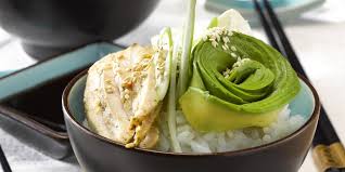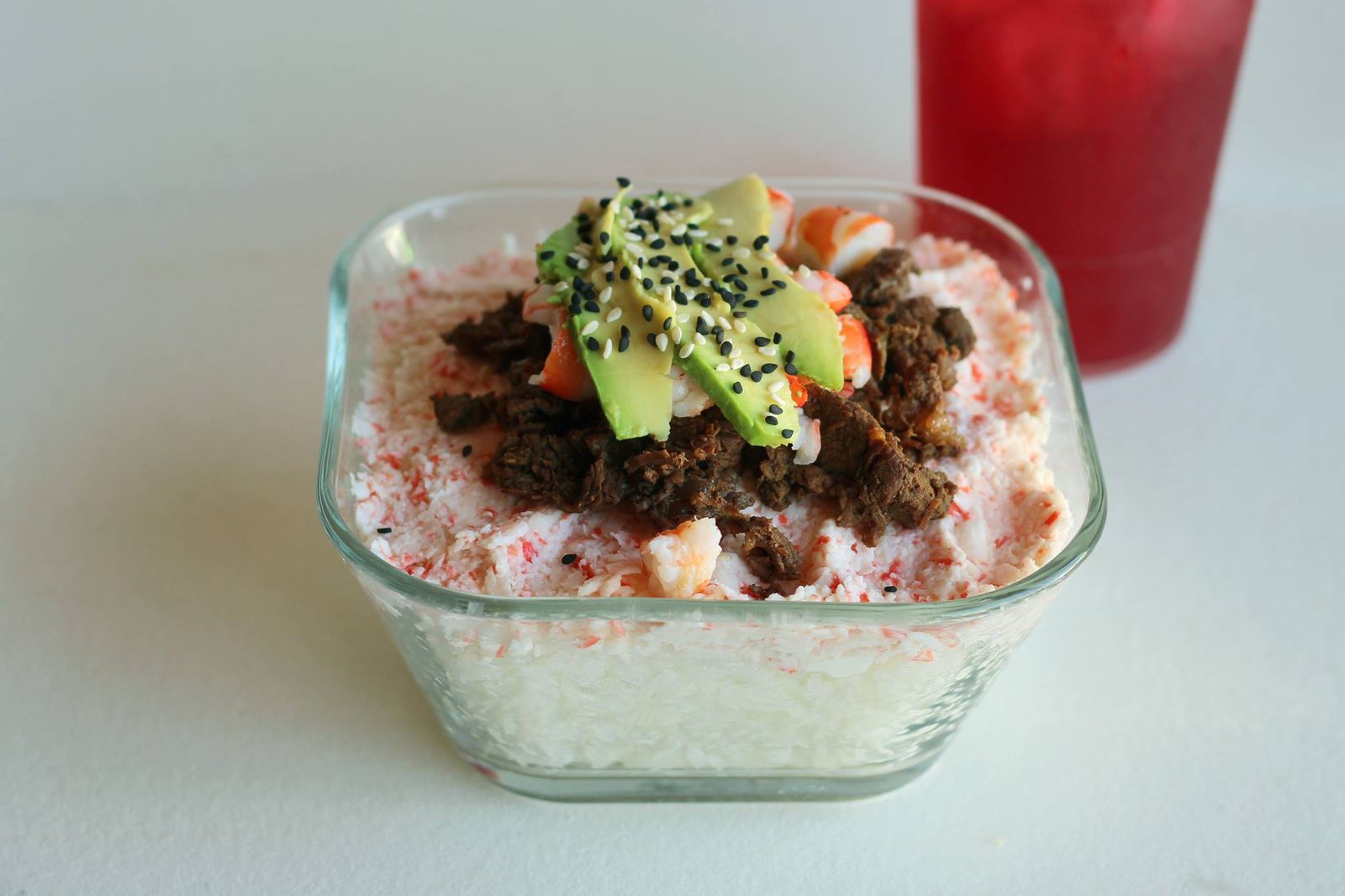 Arroz blanco con philadelphia y tampico, carne, camarón, tiras de aguacate y ajonjolí.